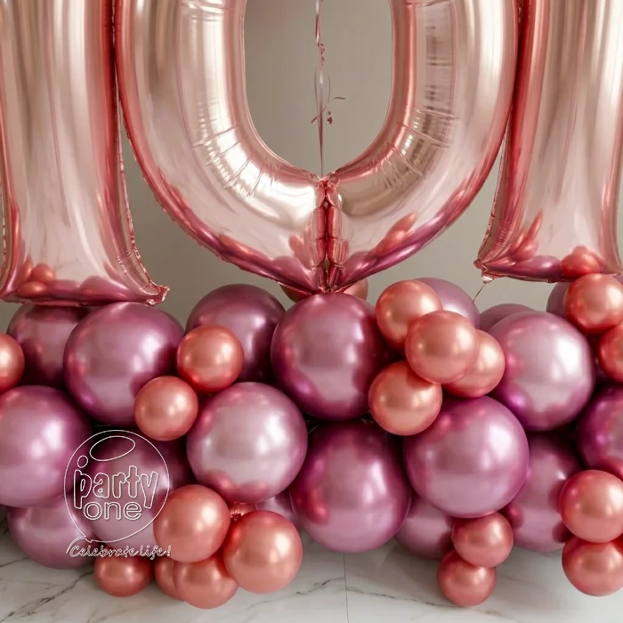 • 1 Balloon Base Arrangement at Bottom (Metallic Pink & Rose Gold) – Approx. 45–50 Balloons