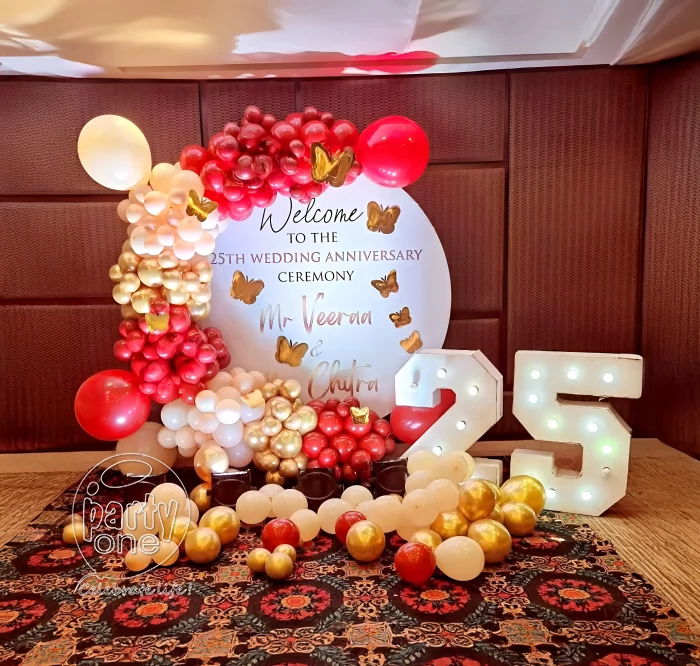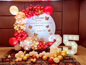 Celebrating your wedding anniversary at home can be simple, but still, you can make it a memorable and unique surprise for your partner on your anniversary. Start with simple anniversary decoration, wall decoration, ceiling balloon decoration, cabana decoration, canopy decoration. The important things that can increase the celebration to be more unique are LED lights, photo hangings, soft fabric drapes which are in light colours. Couples who love a vibrant vibe, red and white balloon decoration is a popular choice. You can opt for normal balloons or metallic accent balloons with fresh flowers to complete the decoration. Whether it’s your first or 50th anniversary decoration, what matters most is the effort you put into it. Even a small balcony or bedroom can be changed into a romantic celebration place. If you’re short on time, PartyOne’s home decorators for anniversary events can help you get the decoration into reality. Whether you’re planning for grand decoration or a minimalist approach, thoughtful room decoration for anniversary celebration can turn a simple evening into a memorable moment.