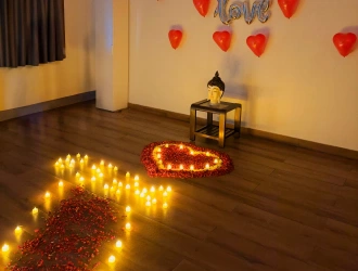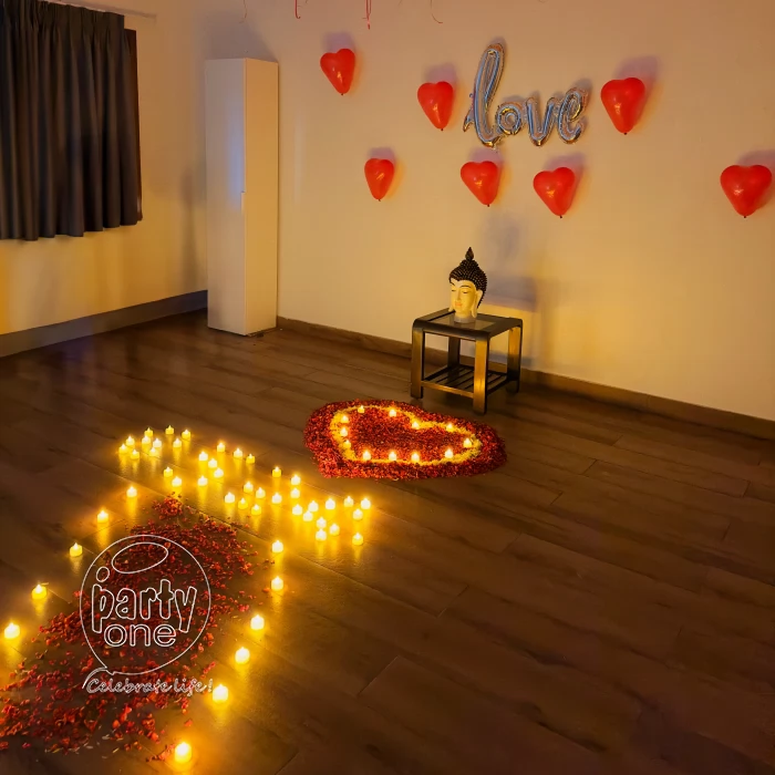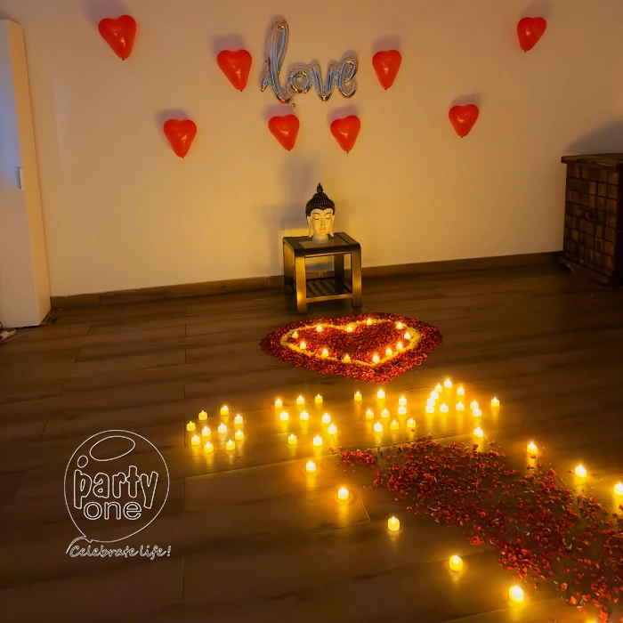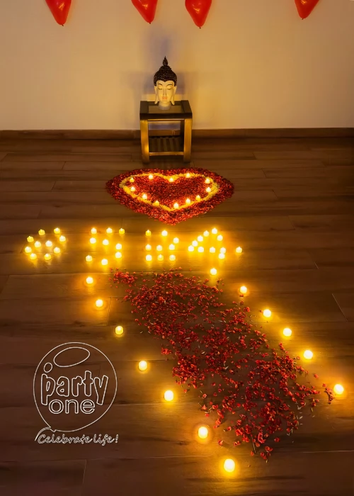 • As important as it is to state your love to your loved ones, it is also important to set the perfect decoration while celebrating your love in a heartfelt way. PartyOne creates an enchanting and romantic ambience for Dreamy Rose Petals & Love Surprise Decoration at home in Chennai. Fresh, fragrant rose flowers give you that sensory satisfaction like no other flowers. A rose petal pathway with both fresh roses and white flowers leading to a red rose heart adored with electric candles adds the perfect amount of spark for your quirky surprise celebrations. This decoration sets that visually pleasing and romantic decoration for all the important milestones for celebrating your love with ceiling heart balloons with ribbons hanging and love foil wall decoration. Choose PartyOne — To set up the perfect ambience and let you have a laid-back celebration, enjoy a lovely and memorable milestones, and score those Instagram-worthy pictures! For a smooth celebration, have a reliable power supply and allocate PartyOne balloon decorators 3 hours prior to the event for everything to come together.