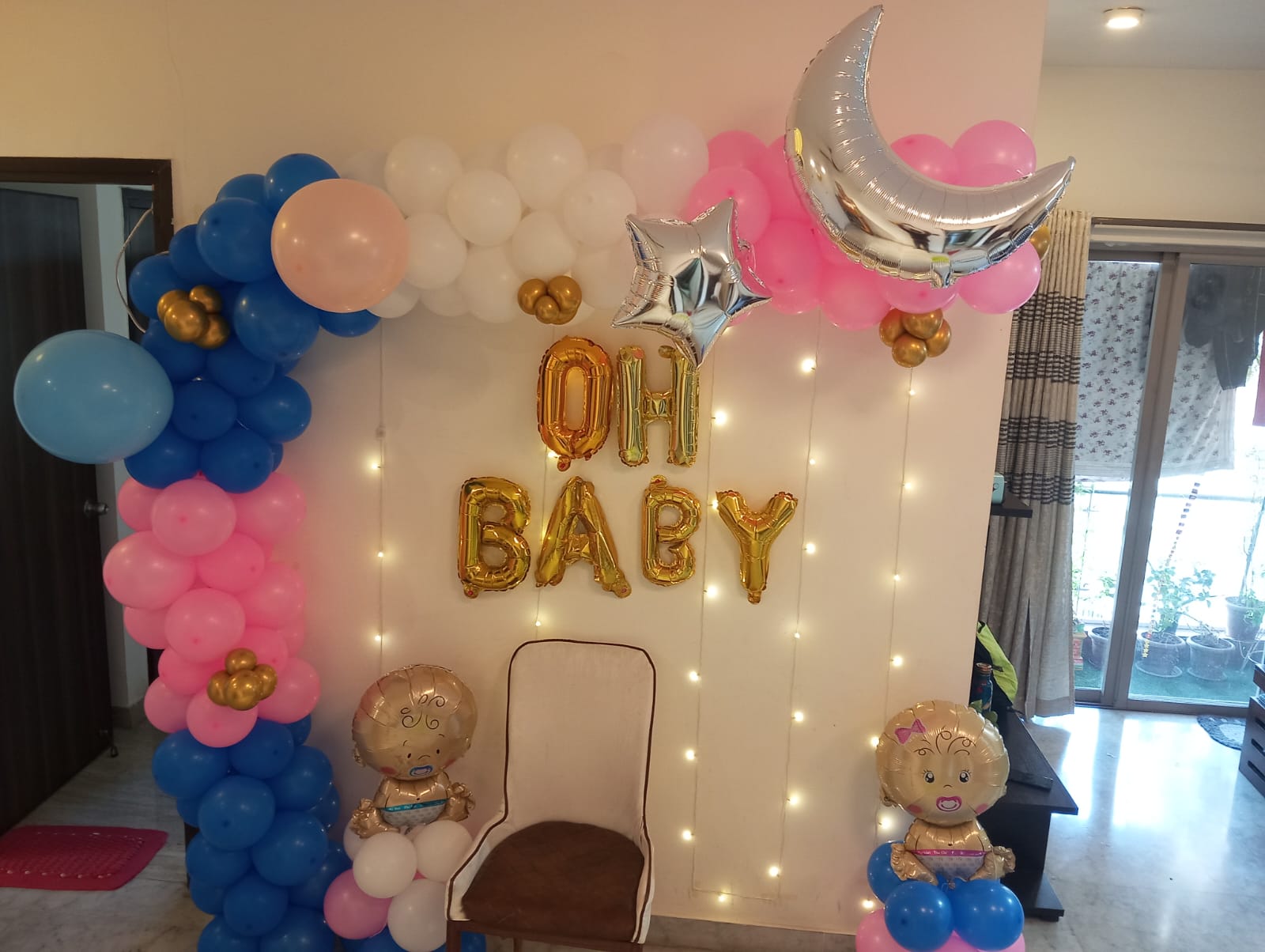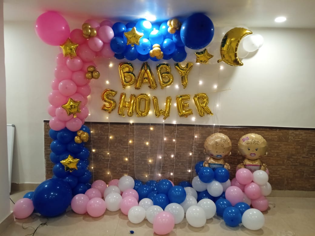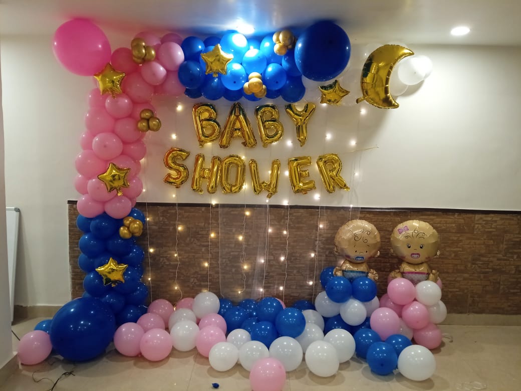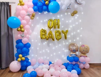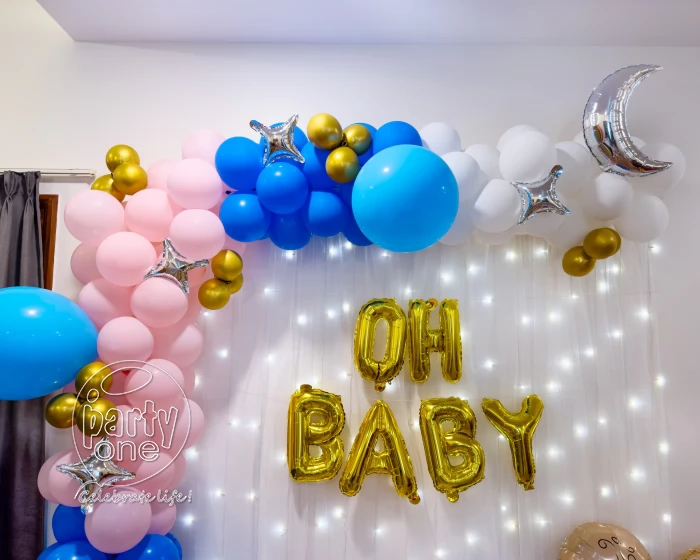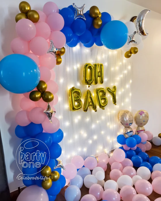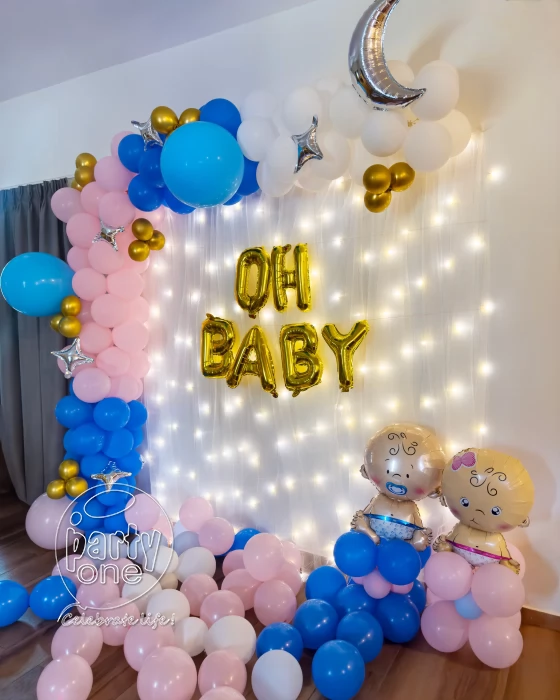 • Finally, here is the “Oh Baby Pink and Blue Baby Shower Decor” in Chennai about a charming and lovely decoration aimed at a baby showering event. A pack of Oh Baby golden foil balloons shimmer, joy, and excitement are just written all over this beautiful decoration. There are simple but very beautiful Pixel Lights that make the place very magical. The stand-up arch of balloons, which has pastel blue, latex white and pastel pink, is a beautiful addition to the interior and spreads happiness. To balance the arch, there are pink and blue balloons, which create a very soft and delicate mood in the atmosphere. The decoration also has cute star foil balloons, and the engagement of an interesting moon-shaped silver foil balloon to give a space touch. For the children, there is nothing like the cute baby boy foil balloons and the baby girl foil balloons to complement the decor. The balloon pillars, which are each 1 ft tall, when standing erect, are greatly conspicuous. Leaving balloons floating throughout the venue gives a cheerful ambience to the room, and just adding balloons falling on the floor, which guests can take photos with or have fun falling while taking photos. Wow, everyone, with the “Oh Baby Pink and Blue Baby Shower Decoration”, and make your baby shower grand.