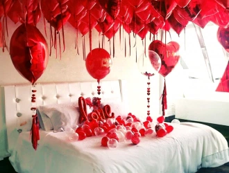 • 25 Small Heart shaped balloons on bed (Red and Crystal clear)