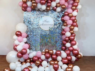 • Wow, you won’t believe your eyes! Transform your anniversary celebration into a dazzling spectacle with our PartyOne’s Silver Sequin Rose Gold Anniversary Decoration in Faridabad. Picture this: a stunning 6×6 ft shimmering sequin panel that catches the light and sparkles at every angle! When you add a striking “Happy Anniversary” sun pack board cutout that draws attention, you'll have the ideal background for all those priceless pictures. But hold on, things get better! A lavish balloon arch with 250 balloons in opulent shades of rose gold chrome, soft light pink, opulent gold chrome, and crisp white is also featured. This eye-catching centerpiece is bound to leave everyone breathless. And just when you thought it couldn’t get any more fabulous, we’ve thrown in a towering 3 ft balloon pillar and two elegant white macron balloons to elevate your decor game! Remember that, some fun with thirty stray floor balloons around the space for an added bit of flair. You'll be wondering how you ever celebrated if such genius hadn't illuminated your big day! Prepare yourselves for absolute magic—this anniversary deserves nothing less as spectacular!