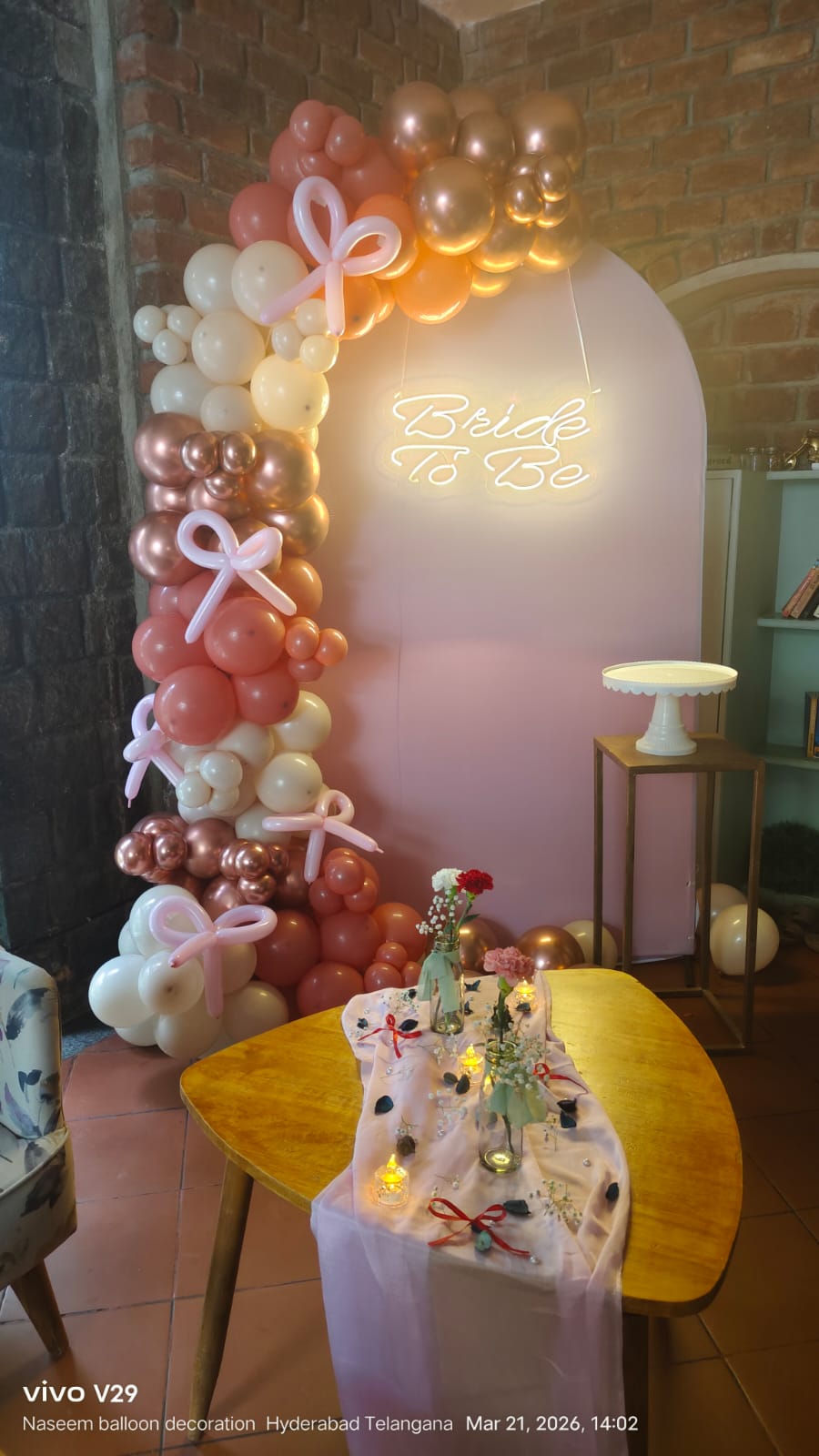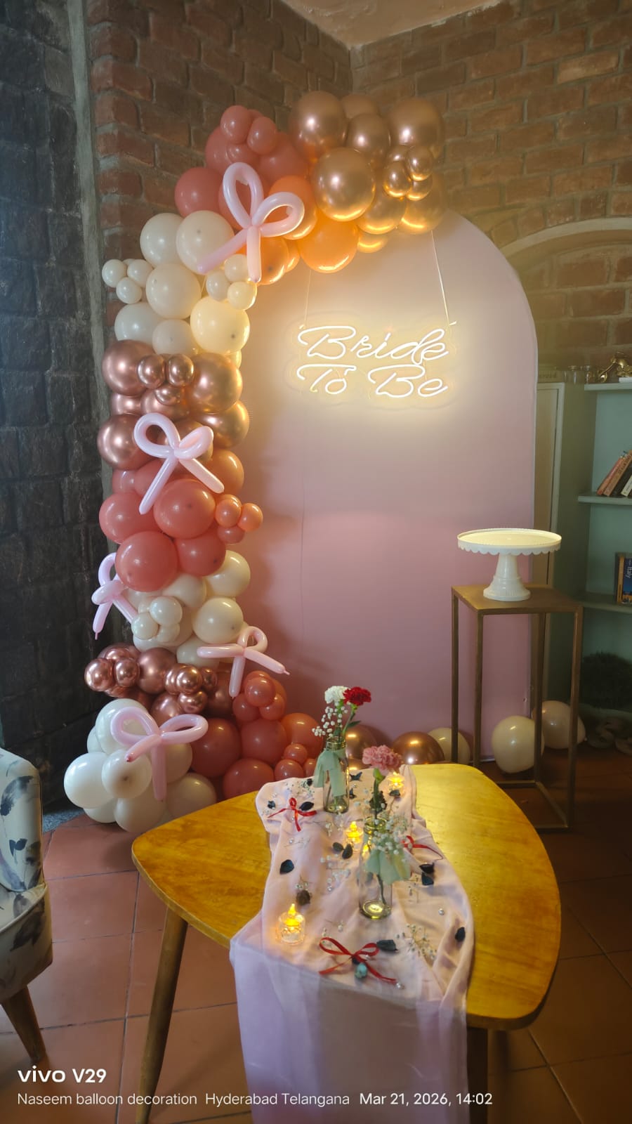 • Arch of 200 balloons ( Rose gold Chrome, White latex and Peach yellow latex color)