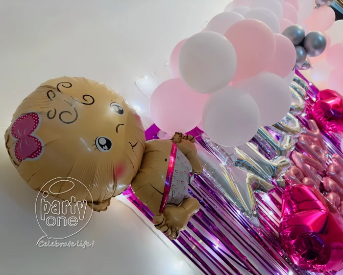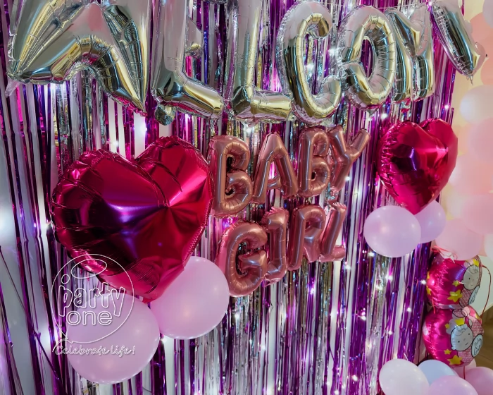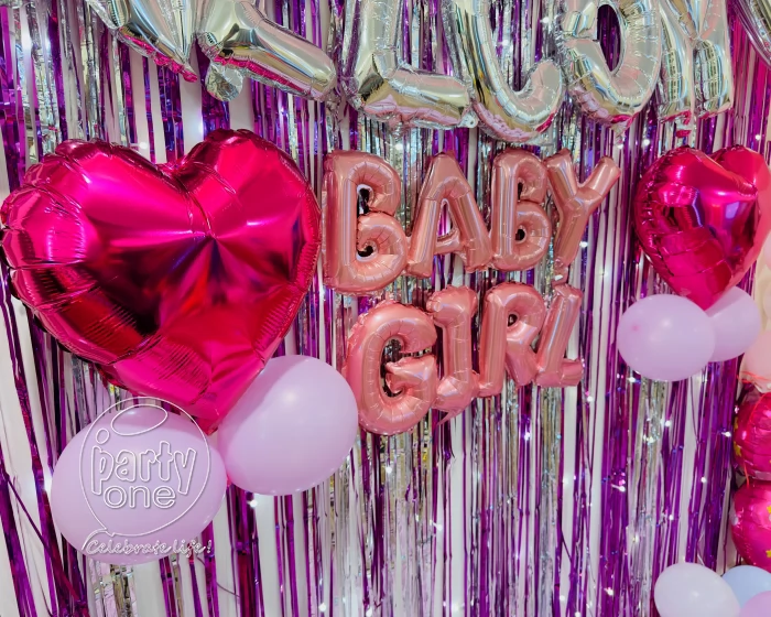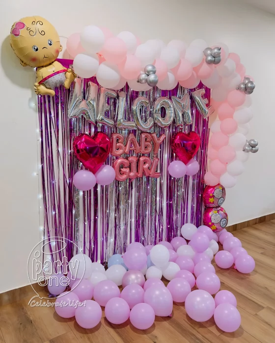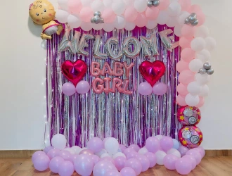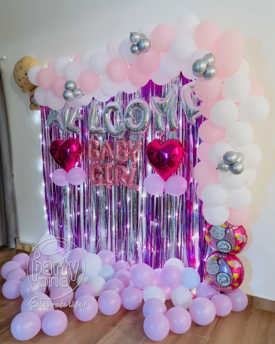 • Celebrate the welcoming of your little one with the adorable, cute baby girl welcome decoration in Ghaziabad from PartyOne’s professional balloon decorators! A semi-balloon arch of pastel pink and white latex balloons creates a charming centerpiece. Four small silver chrome balloon bunches add a touch of sparkle to your baby girl's welcoming ceremony, and "Welcome" silver letter foil balloons of 16 inches warmly greet guests, letting you know you have your little baby girl in your house. Rose gold "Baby Girl" letter foil balloon shines brightly, giving you the perfect glimpse of celebration, and pink and silver foil frill curtains with pixel LED lights add a lovely backdrop. Baby girl-themed foil balloons and free-floating floor pastel pink and white balloons on the stage enhance the playful ambience, making everything picture-perfect. When you have a reliable power supply allocate PartyOne three hours for setup to make your celebration flow smoothly.