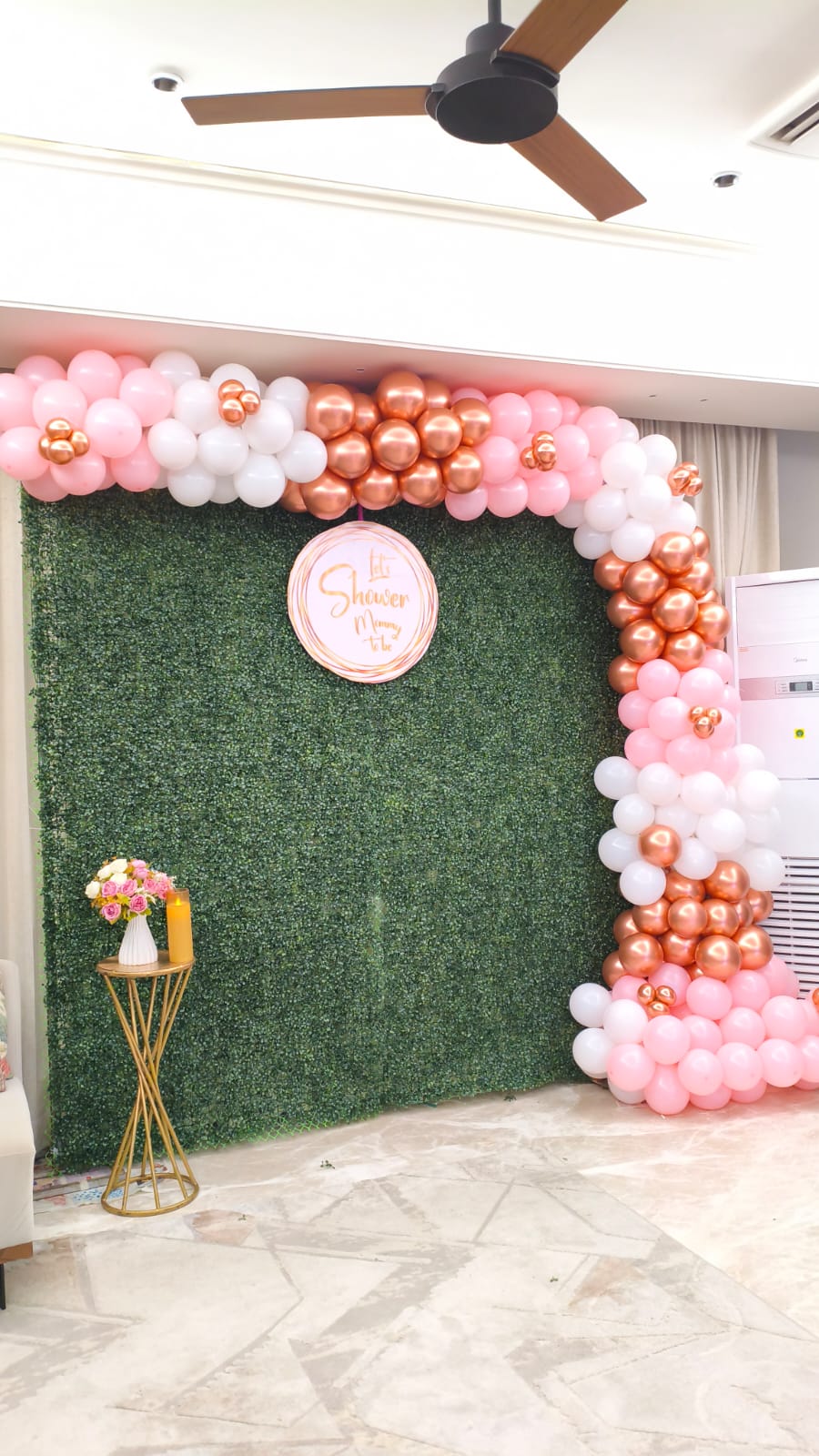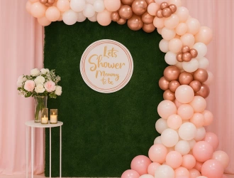• Arch of 150 balloons(Chrome rose gold, White, Light pink)