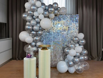 • This exquisite decoration is designed to create a visually stunning and unforgettable atmosphere to make your birthday celebration shine with PartyOne Shimmery Silver Sequin Birthday Decoration in Gurgaon. Throw an Unforgettable Shimmery Silver Theme Birthday Party with silver sequin all the way home with PartyOne balloon decoration services. Experience elegance with Mesmerizing Decoration Setup. For the beautiful centerpiece a dazzling silver sequin backdrop which glimmers under any light, measuring 6×6 ft, sets the perfect stage for photos with loved ones in a glamorous ambiance. For a warm glow to enhance the festive mood, the neon light greeting “Happy Birthday” gives a vibrant and modern touch. Dynamic depth and texture to the decor is added by balloon arch, featuring a stunning mix of white, and silver chrome balloons with cake stands. Proudly standing macron balloons enhance the grandeur of the setup! This eye-catching arrangement is sure to be a highlight for the celebration and all guests. For a smooth celebration, have a reliable power supply and allocate PartyOne balloon decorators 3 hours prior to the event for everything to come together.
