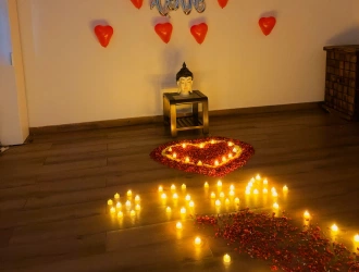 • As important as it is to state your love to your loved ones, it is also important to set the perfect decoration while celebrating your love in a heartfelt way. PartyOne creates an enchanting and romantic ambience for Dreamy Rose Petals & Love Surprise Decoration at home in Hyderabad. Fresh, fragrant rose flowers give you that sensory satisfaction like no other flowers. A rose petal pathway with both fresh roses and white flowers leading to a red rose heart adored with electric candles adds the perfect amount of spark for your quirky surprise celebrations. This decoration sets that visually pleasing and romantic decoration for all the important milestones for celebrating your love with ceiling heart balloons with ribbons hanging and love foil wall decoration. Choose PartyOne — To set up the perfect ambience and let you have a laid-back celebration, enjoy a lovely and memorable milestones, and score those Instagram-worthy pictures! For a smooth celebration, have a reliable power supply and allocate PartyOne balloon decorators 3 hours prior to the event for everything to come together.