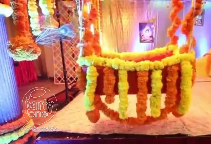 The birth of a newborn is undoubtedly a special and exciting event for new parents. But it comes with the burden of throwing a naming ceremony party for close friends and family. Parents who want to sit back and relax on this special occasion and spend time with their newborn turn to our services. We, at PartyOne, allow new parents to have a memorable and fun-filled celebration by including unique and entertaining elements in the celebration. Our professional namkaran ceremony decorators offer a range of unique themes and decoration ideas for a beautiful celebration. If you have a tight budget, we use balloons to decorate the venue, as it is affordable, versatile, and accessible. We design an arch made of balloons and fill them with LED lights for brightness. We use them to adorn tables, cradles, railings, and other surfaces. PartyOne professional naming ceremony decorators don't limit themselves to balloons. They use many other elements, such as fairy lights, to adorn bare walls and doorways, Chinese lamps to enhance the decorative attractiveness of a naming ceremony decoration at home, and flowers to create designs and curtains. We also use paper decor, including paper vehicles, clothes, and shoes to give the venue a cute touch. Moreover, our taste in colors depends on the baby's gender. Some popular theme ideas include a crescent moon, fairytale white, cartoon character, modern, traditional, rainbow connection, enchanted garden, space odyssey, under the sea, rustic blue, floral, baby pink, and more. We also arrange personalized treats for the guests complementing the theme to make the namkaran ceremony celebration even more special.