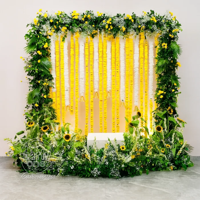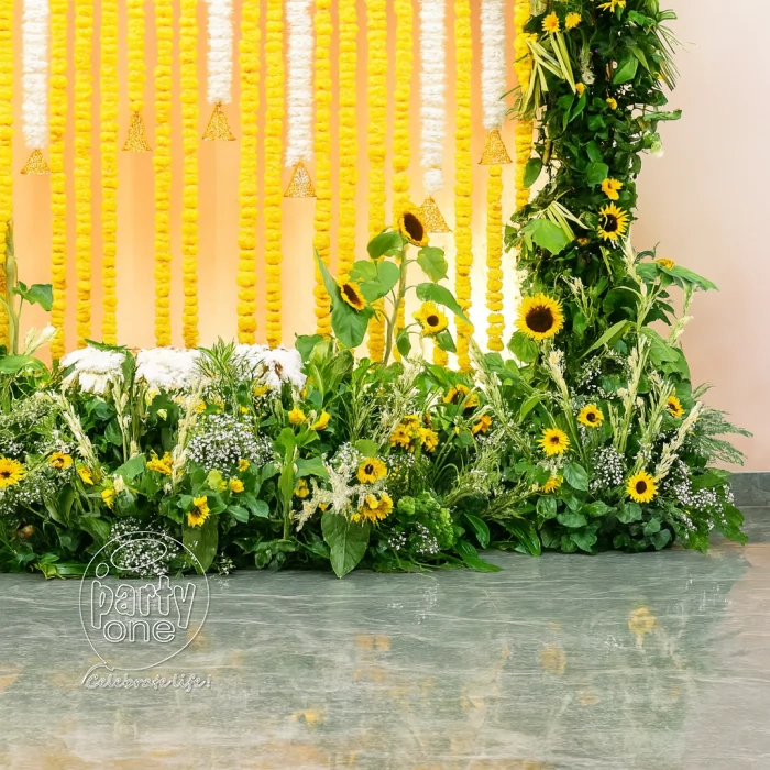 • Real Flower Decoration On Stand(Chrysanthemum String, Daisy, Gypso, Mix Leaves, Sunflower, Tube Rose, And Lotus)