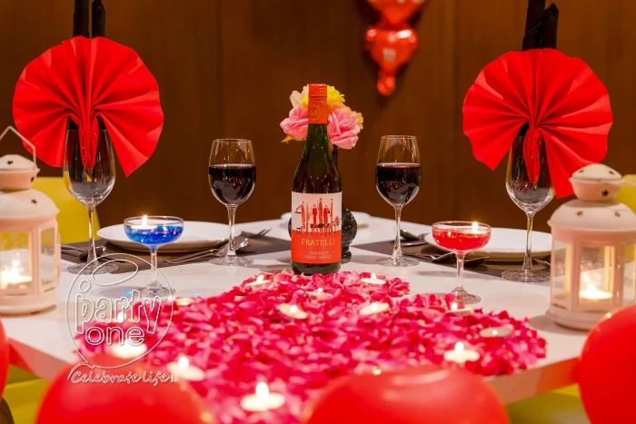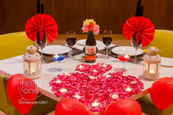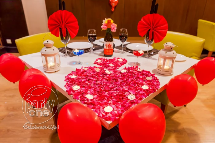 • Decorated table with flower petals, candles and balloons