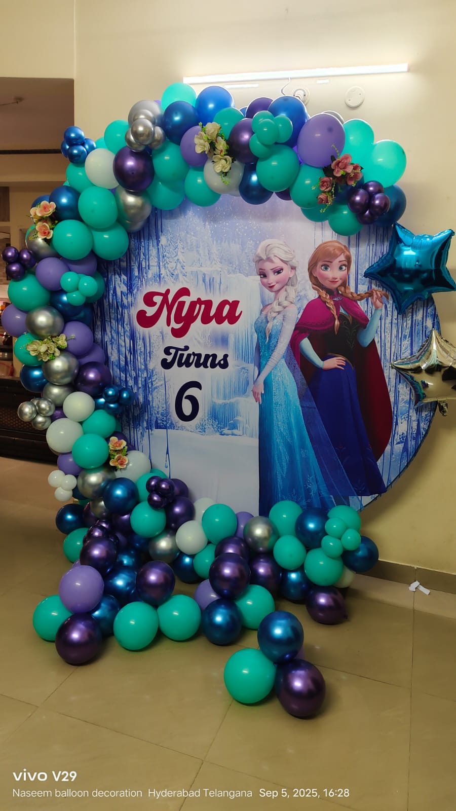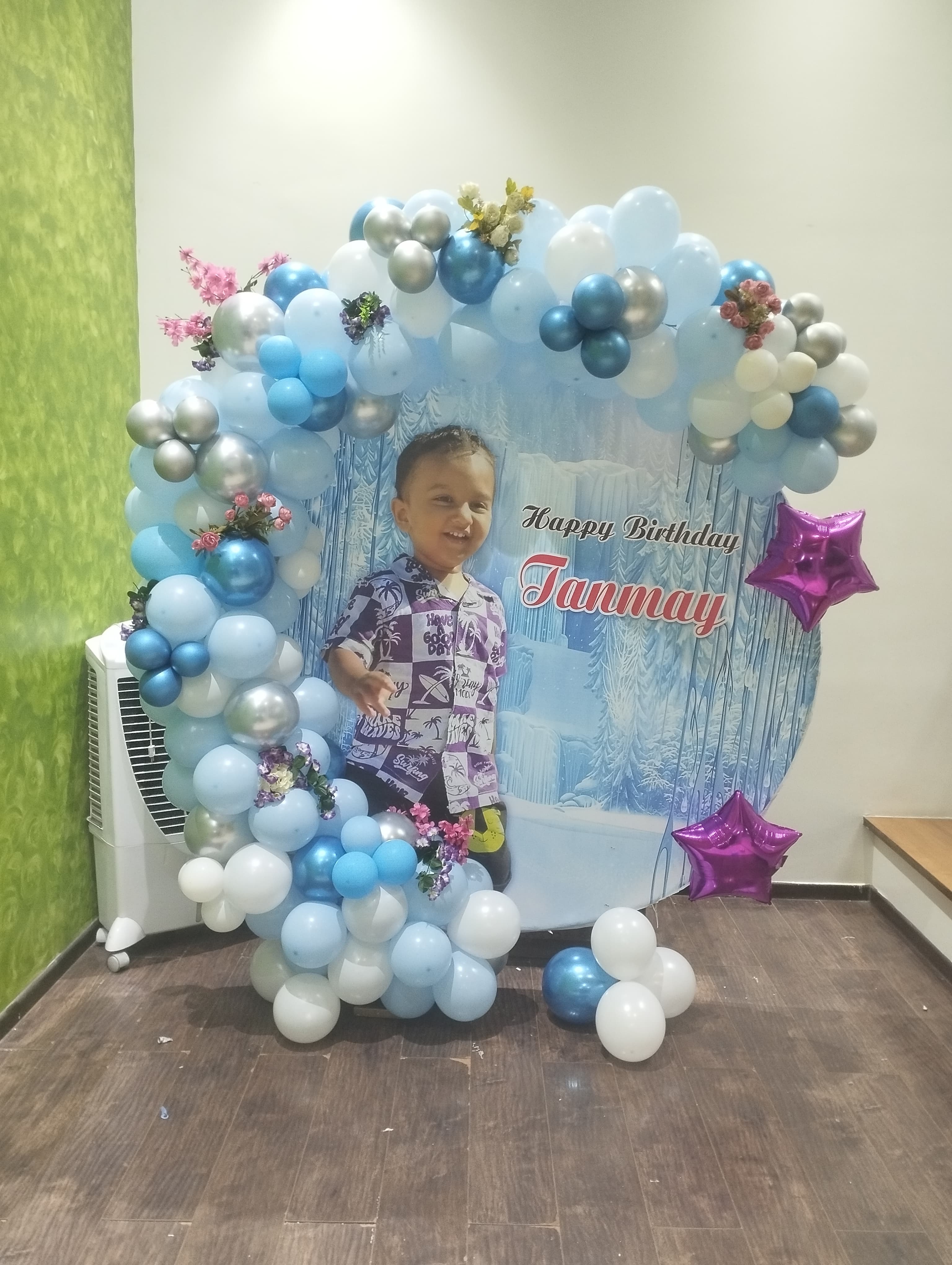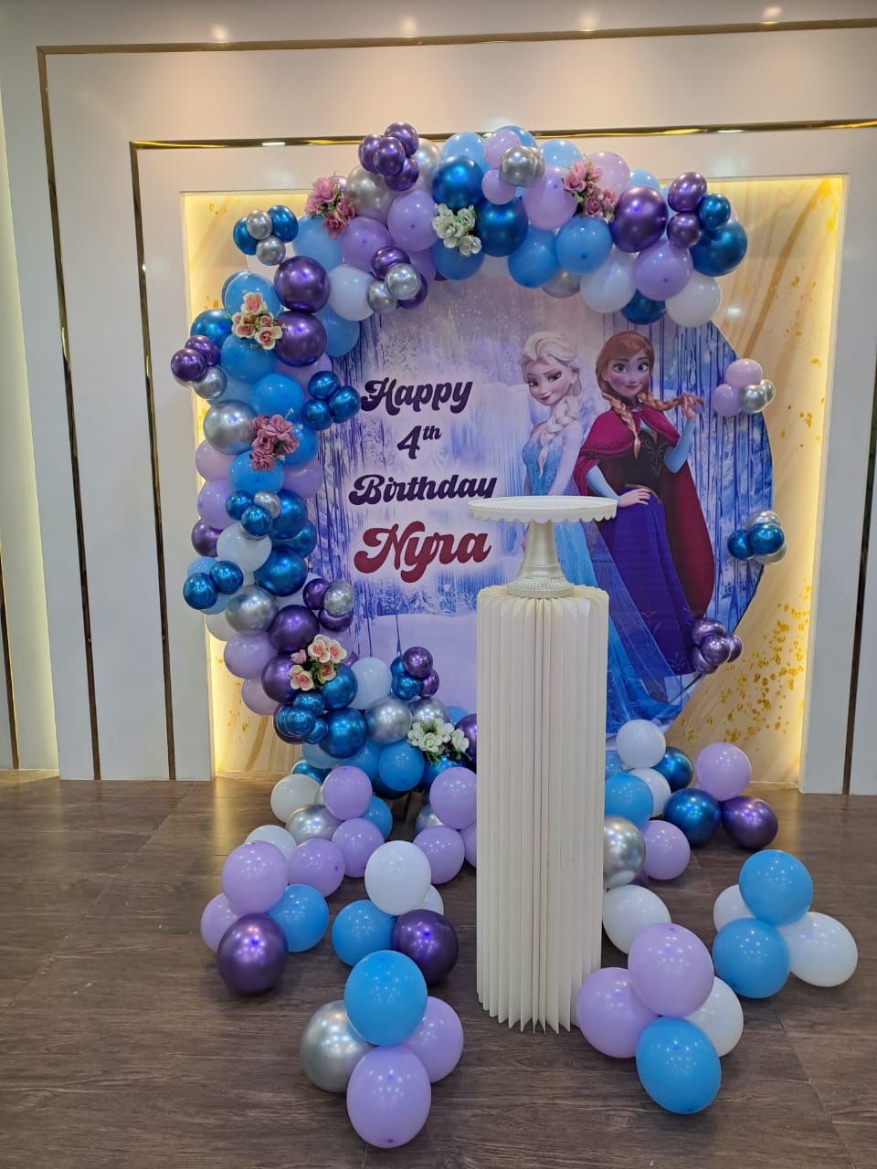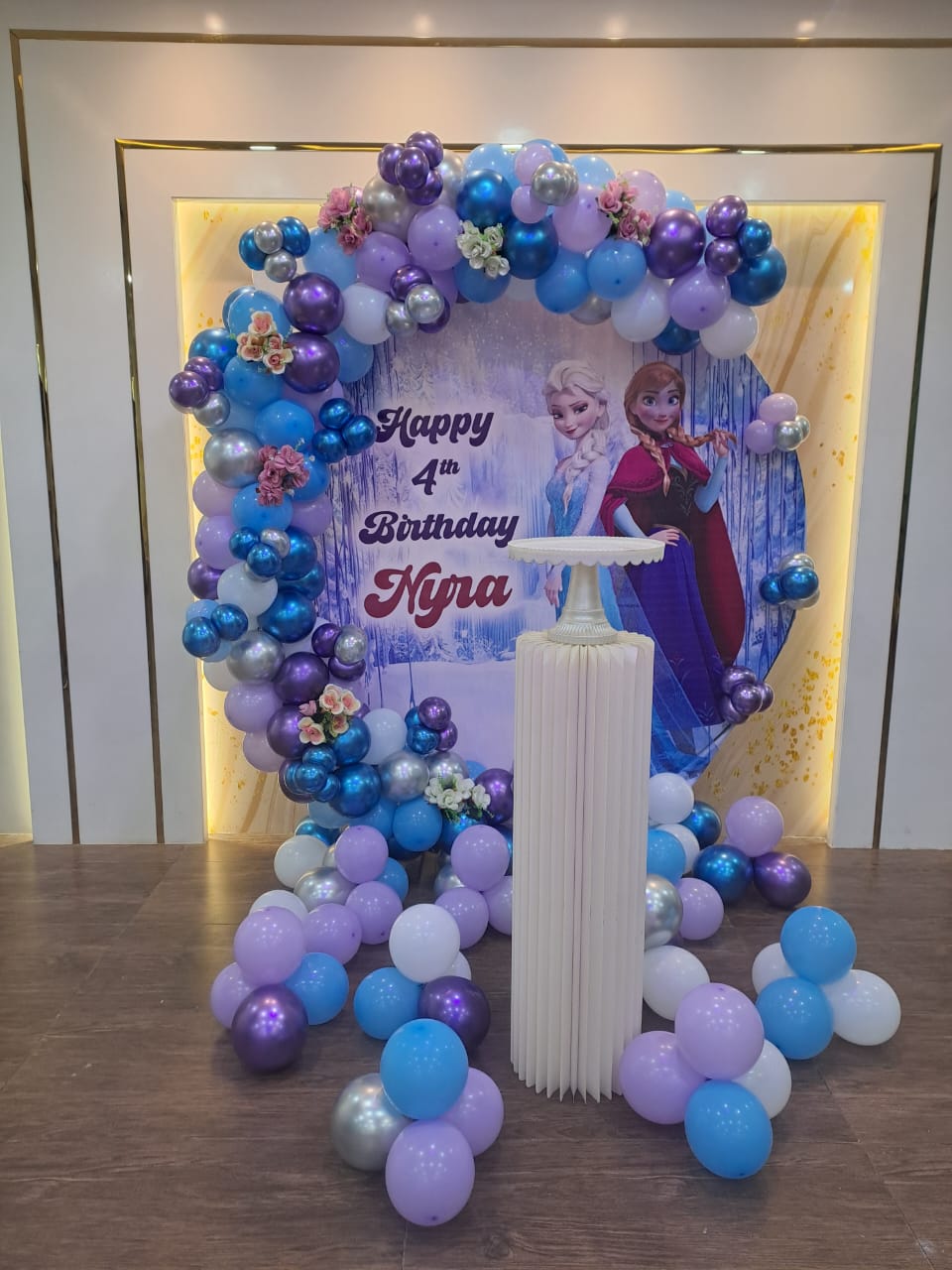 • Theme arch of 250 balloons (Pastel blue, White, Blue chrome, Silver chrome, Purple chrome color)