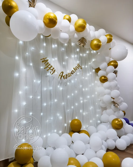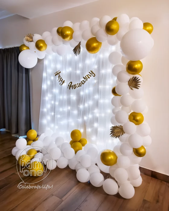 • Create a realm of timeless elegance with our white and golden-themed birthday decoration, designed to transform any venue into a radiant celebration of joy in Indore. An arch made up of 200 balloons including white and hint few golds chrome that will create a beautiful outlook. The aura is further intensified by nine meters of delicate net fabric cloth, draping gracefully to add a touch of softness. A dazzling "Happy Anniversary" banner in shimmering gold serves as a warming centerpiece, celebrating the occasion with elegance and flair. It is perfect for any cake cutting and picture backdrops. Celebrate your special day with your loved ones and a vibe that everybody likes. If your anniversary is coming up, or you plan to surprise your parents on their anniversary and do not know how you should plan it? Start with us. We have numbers of decorations for different occasions and this timeless elegant decoration is bound to make your eyes shine. White and Gold, a combination like no other with beautiful white net curtains falling in the background along with fairy lights. Just imagine surprising your husband, wife or anyone on their anniversary can instantly make them happy, excited and joyous. This decoration best suits with white or light-colored wall colors, would make the space look calm, happening and spacious. If you want to make this occasion more memorable, you can also book a caricature artist and get a beautiful experience of live drawing. That would be a perfect gift for you as well as you also ask your guests to try it and give it to them as a token of love.