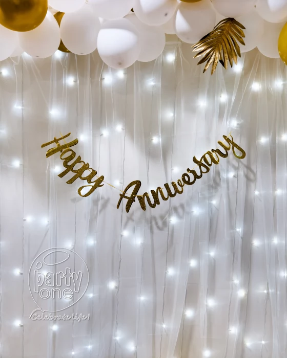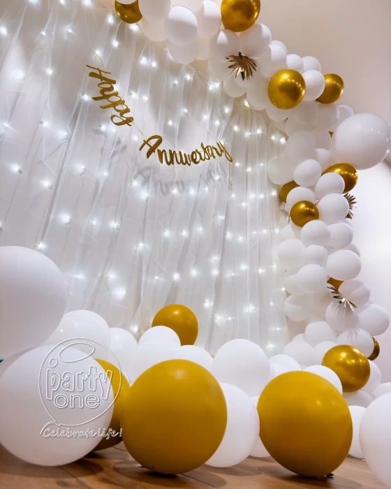 Planning to celebrate wedding anniversary decoration, start by selecting a romantic space like your living room, terrace, balcony, or backyard. A themed setup with the right colours can make the venue more special. Anniversary balloon decor in gold, rose gold, or silver adds an instant vibe. Hang a "happy anniversary" banner and use a simple flower decoration for a romantic approach. For an interactive touch, create a photo zone using anniversary background decoration like a curtain of lights with pictures from your wedding and milestones. A focal cake table with an anniversary topper wedding cake makes a grand centerpiece. Elements like couple initials, framed wows, or a mini memory timeline improve the decor. When you're in doubt, consult PartyOne wedding anniversary decorators who is specialized in romantic gatherings. Even with a small guest list, your wedding anniversary decoration can be classy, romantic, and unforgettable perfect for sharing joy with loved ones while keeping it cozy and meaningful.