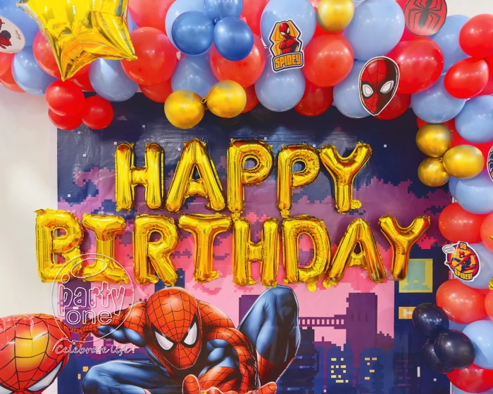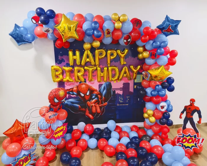 • With our PartyOne’s Marvel Spider-Man Theme Decoration in Indore, turn your party into a great Spider-Man adventure! While the striking organic arch of 300 balloons in brilliant metallic blue, red, and golden chrome wonderfully captures that heroic spirit, this vivid 6x6 ft flex backdrop sets the stage for a fantastic birthday celebration. Add five whimsical Spider-Man foil balloons to accentuate the celebrations, and a beautiful “Happy Birthday” golden letter foil balloon to appeal to guests of all ages. Along with a show-stopping 2-foot Spider-Man paper cut-out atop a spectacular balloon pillar, the party comes alive with 13 amusing Spider-Man paper cut-outs strewn all around. Two striking 2-foot balloon pillars will accentuate every corner and let the floor fill with 30 free balloons—perfect for unplanned photo moments or just bouncing about! Your small hero deserves nothing less than a day to remember. Prepare yourself to grab hold and produce a lifetime of memories!