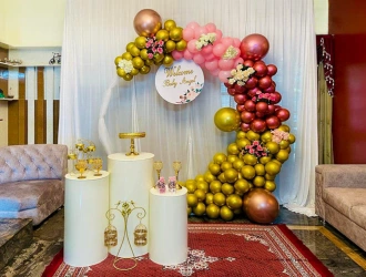 • Welcome your little bundle of delight in style with this brilliant Red and Gold Metallic Welcome Baby Decoration in Indore from PartyOne! The wonderful decoration will turn your home into a magical land, perfect for celebrating your baby's birth. Imagine how happy your guests will be when they walk into a room with beautiful metallic rings balloon decoration that make a fascinating background. Exquisite balloons in deep maroon, glittering gold, and delicate pastel pink, all set against a sea of A lovely "Welcome" board taking front stage to announce the arrival of your child. Three graceful cylinders with cake stands, just for your festive delicacies. Ten realistic synthetic flowers accentuating a little of natural attractiveness. Your heart will be happy, and you will have lifelong memories from this magical decoration. It's an honouring of love, hope, and fresh starts, not only a decoration! Don't miss this opportunity to create a unique greeting for your child. Book immediately so that the happy celebrations start! For a smooth celebration, have a reliable power supply and allocate PartyOne balloon decorators 3 hours prior to the event for everything to come together.