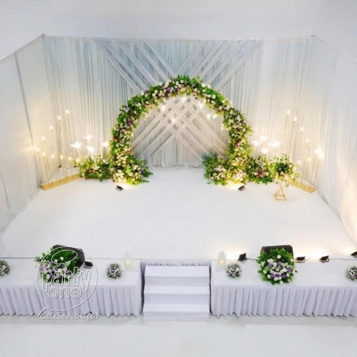 • 1 set of approx. 20–24 ft width of Full wall draping with layered design