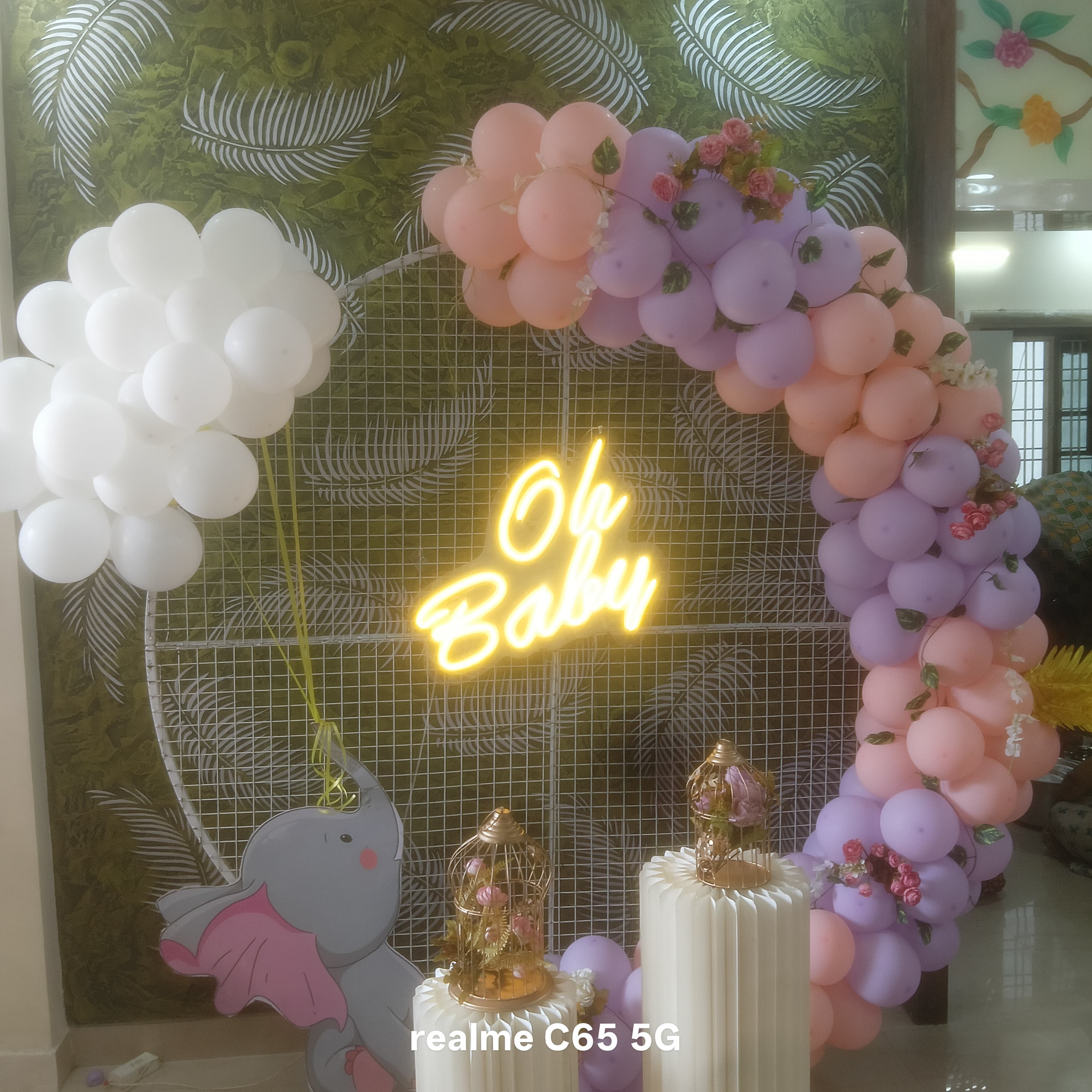 • For a picture-perfect celebration, get ready for an adorable baby shower with PartyOne’s cute oh baby shower ring decoration by our professional balloon decorators in Kolkata! Enjoy a lovely setup that features a 6x6 ft mesh stand adorned with a magnificent balloon arch of 100 pastel pink and pastel purple balloons, creating a congratulatory backdrop and setting a perfect ambience. A sun pack board cutout of a charming baby elephant hanging onto a cloud of balloons adds a magical touch. The “Oh Baby” neon light shines brightly, celebrating your loved ones, suitable for welcoming baby showers or naming ceremonies. Cloud-shaped balloon artistry with 30 white latex balloons to lift your ambience to the clouds. 2 bubble balloons and 4 bunches of artificial flowers paired with three golden leaves give an amazing detail to your celebrations. Four white artificial flower strings and one green leaf string complete the enchanting look. Finally, 20 loose floor balloons on the floor invite playful fun. Ensure a reliable power supply and allocate 3 hours for setting up the ultimate decoration.