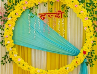 • Red (Haldi) text decoration in Hindi on the backdrop