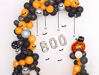 • Halloween theme balloon arch of 250 balloons (Orange, Black, Black polka dot, Silver chrome and White color)