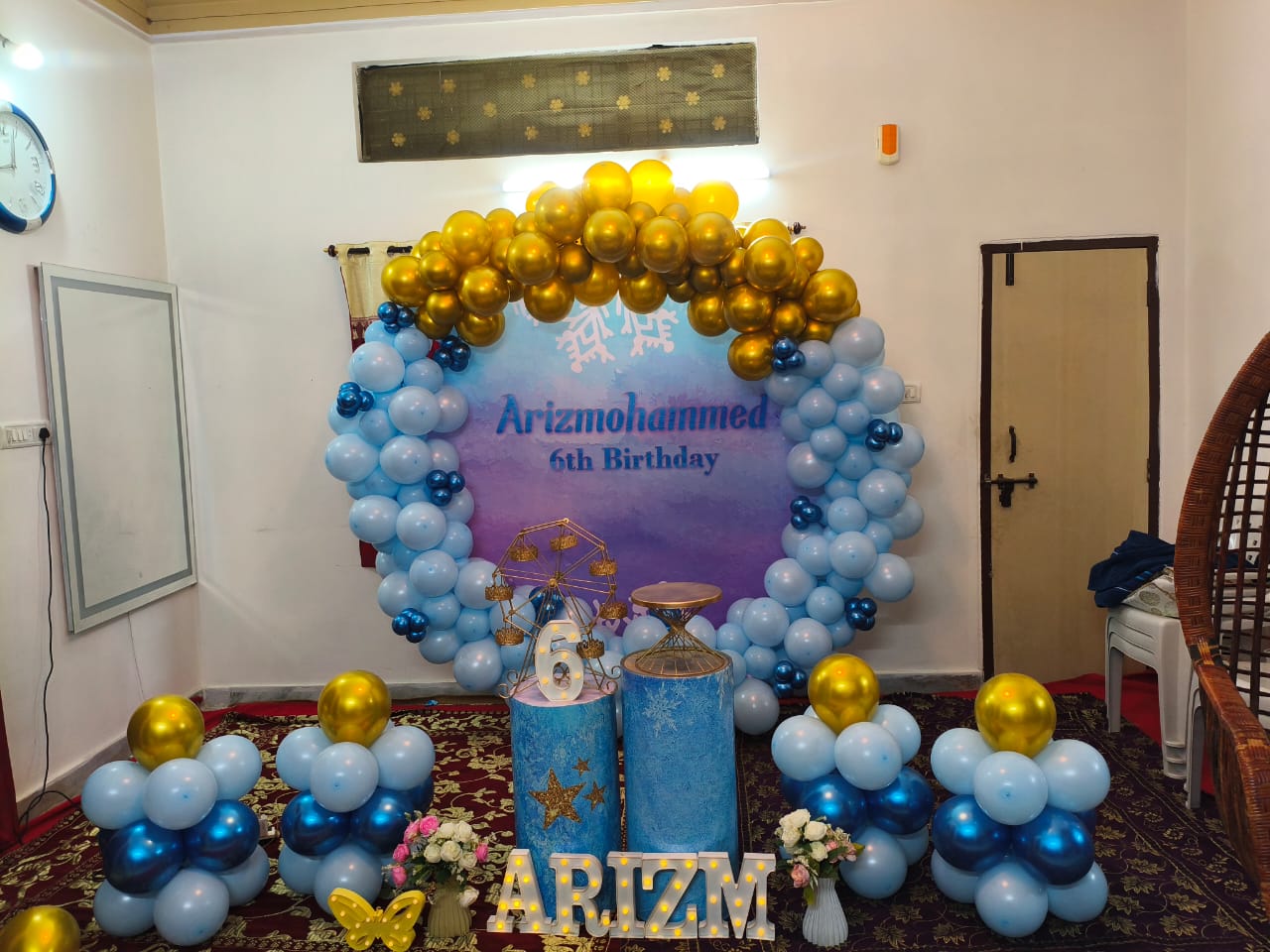• Balloon arch of 250 balloons (Pastel blue, Golden chrome and Blue chrome color)
