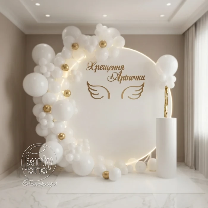 • 140-180 balloons of organic white Balloon arch with gold chrome accents