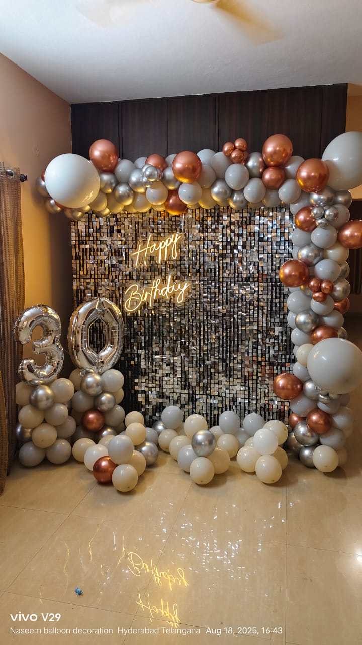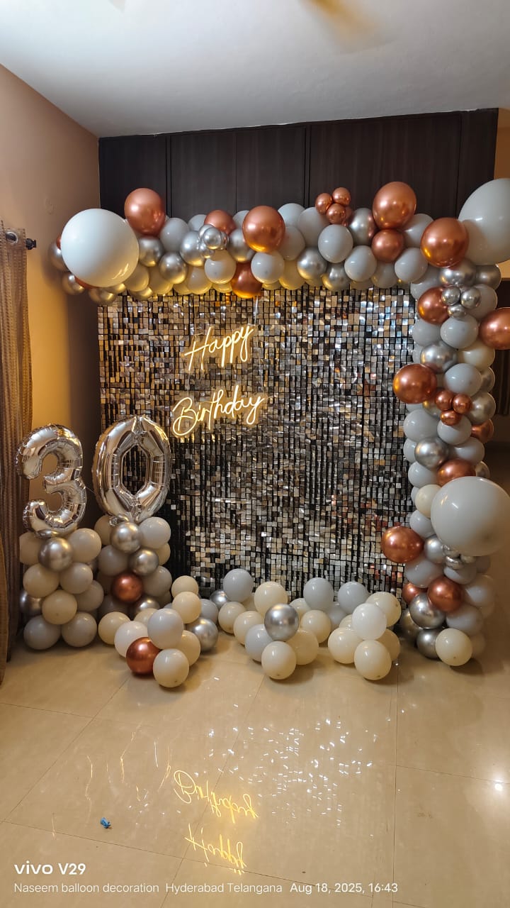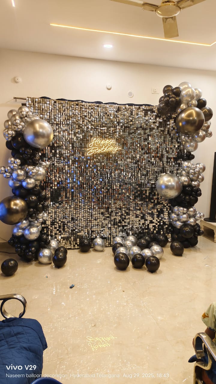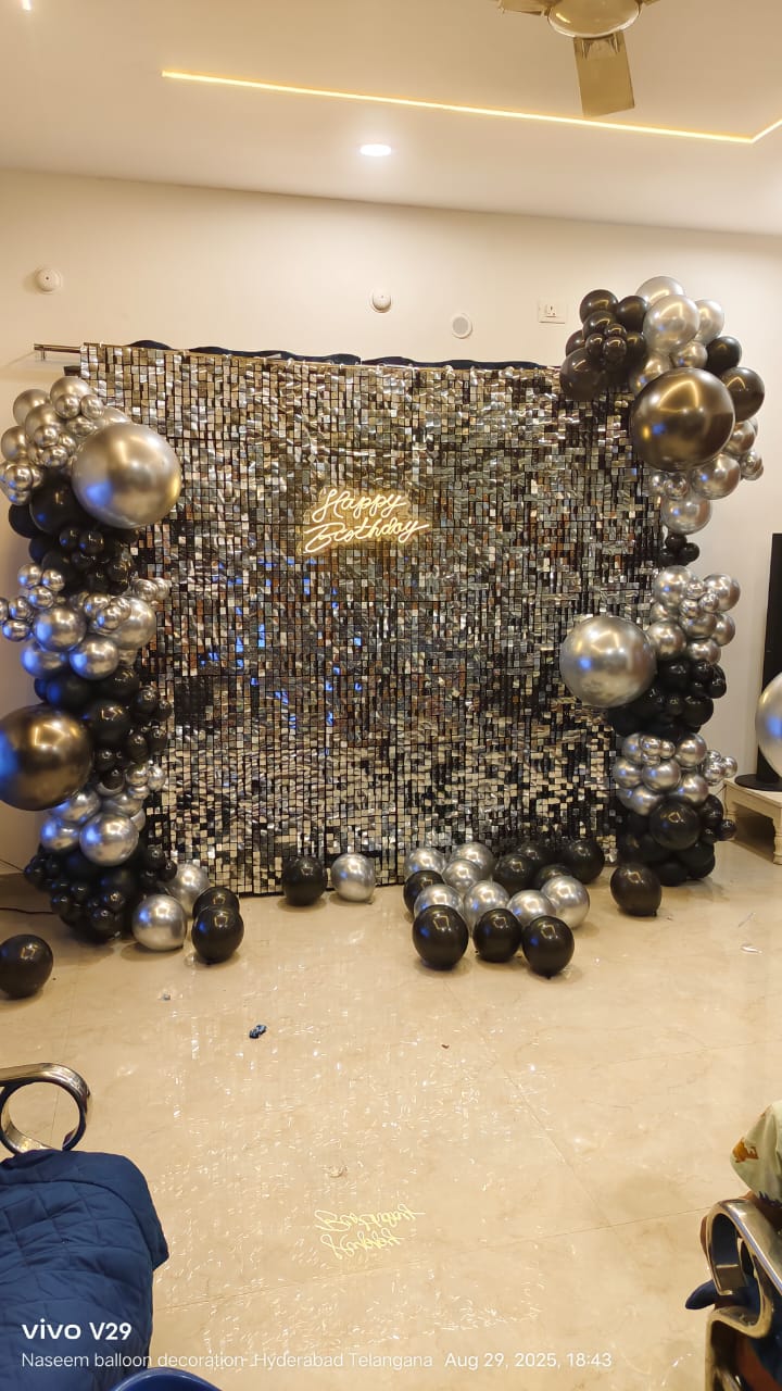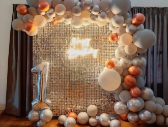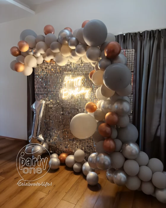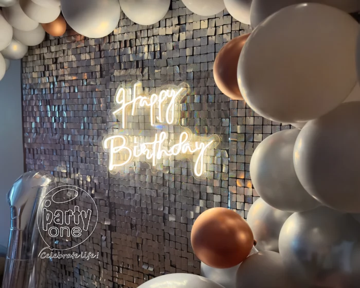 • This exquisite decoration is designed to create a visually stunning and unforgettable atmosphere to make your birthday celebration shine with PartyOne Gold and Silver Sequin Birthday Arch Decoration in Mumbai. For the beautiful centerpiece, a dazzling silver sequin backdrop that glimmers under any light, measuring 6×6 ft, sets the perfect stage for photos with loved ones in a glamorous ambience. For a warm glow to enhance the festive mood, the neon light greeting “Happy Birthday” gives a vibrant and modern touch. Dynamic depth and texture to the decor are added by the Cursive balloon arch, featuring a stunning mix of silver, grey, and gold chrome balloons. The process of combining organic and metallic components in a way that is harmonious. The grandeur of the setting is enhanced by a balloon pillar that boldly stands, which is topped with foil balloons that reveal the age of the balloons. This lovely creation will be one of the things people remember most about the party. This party was even better because of the two grey macron balloons that made it more fun and silly. PartyOne makes sure the party goes smoothly by providing a steady power supply and giving guests three hours to set up before the event. This beautiful work of art will make your birthday party unique and lovely to look at.