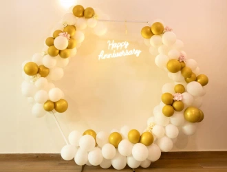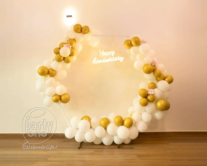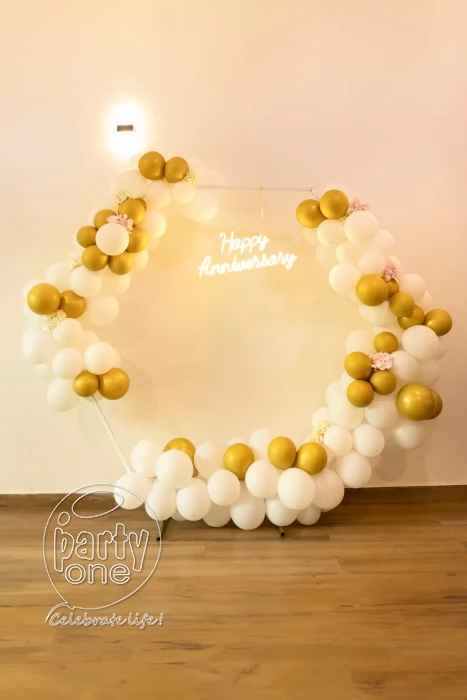 • Elevate your anniversary celebrations with our PartyOnes’ White Hexagon Anniversary Decoration in Mumbai, specifically designed to create an unforgettable ambiance. This stunning ensemble features a striking hexagon ring and 250 pristine white and chrome gold balloons that would bring elegance into any kind of celebration. There are also 10 exquisite artificial flowers complementing the decoration, adding vibrancy to it. An array of colors from the "Happy Anniversary" neon light brightens up the atmosphere, setting a very apt tone for any joyous and festive occasion. This decoration will turn any space—be it a classy meeting or a big bash—attractively into one big party. With this exceptional anniversary decoration services, make every moment really unforgettable. For a smooth celebration, have a reliable power supply and allocate PartyOne balloon decorators 3 hours prior to the event for everything to come together.