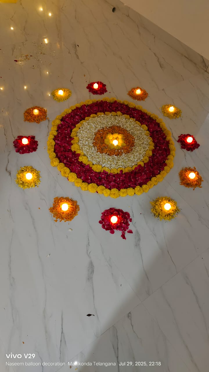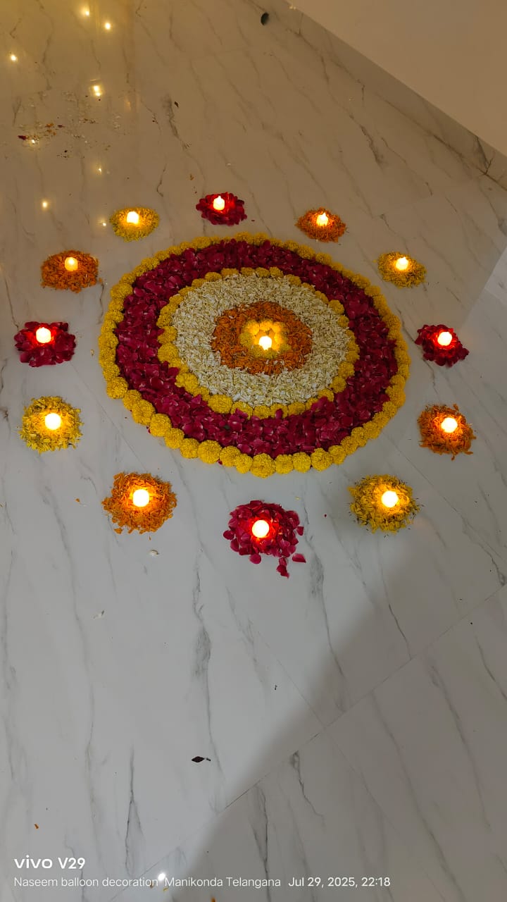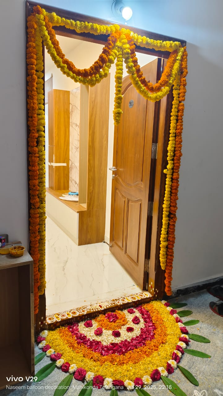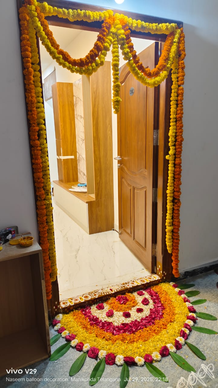 • 1 Half rangoli on entrance door (White Sevanthige, Red rose, Yellow and Orange marigold Petal's, and 12 Mango leaves )