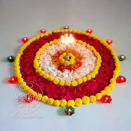 • 1 Rangoli on floor (Yellow marigold, Rose petal's and White Sevanthige)