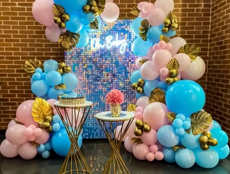 • Arch of 250 balloons (Pastel blue, Pastel pink and Chrome gold)