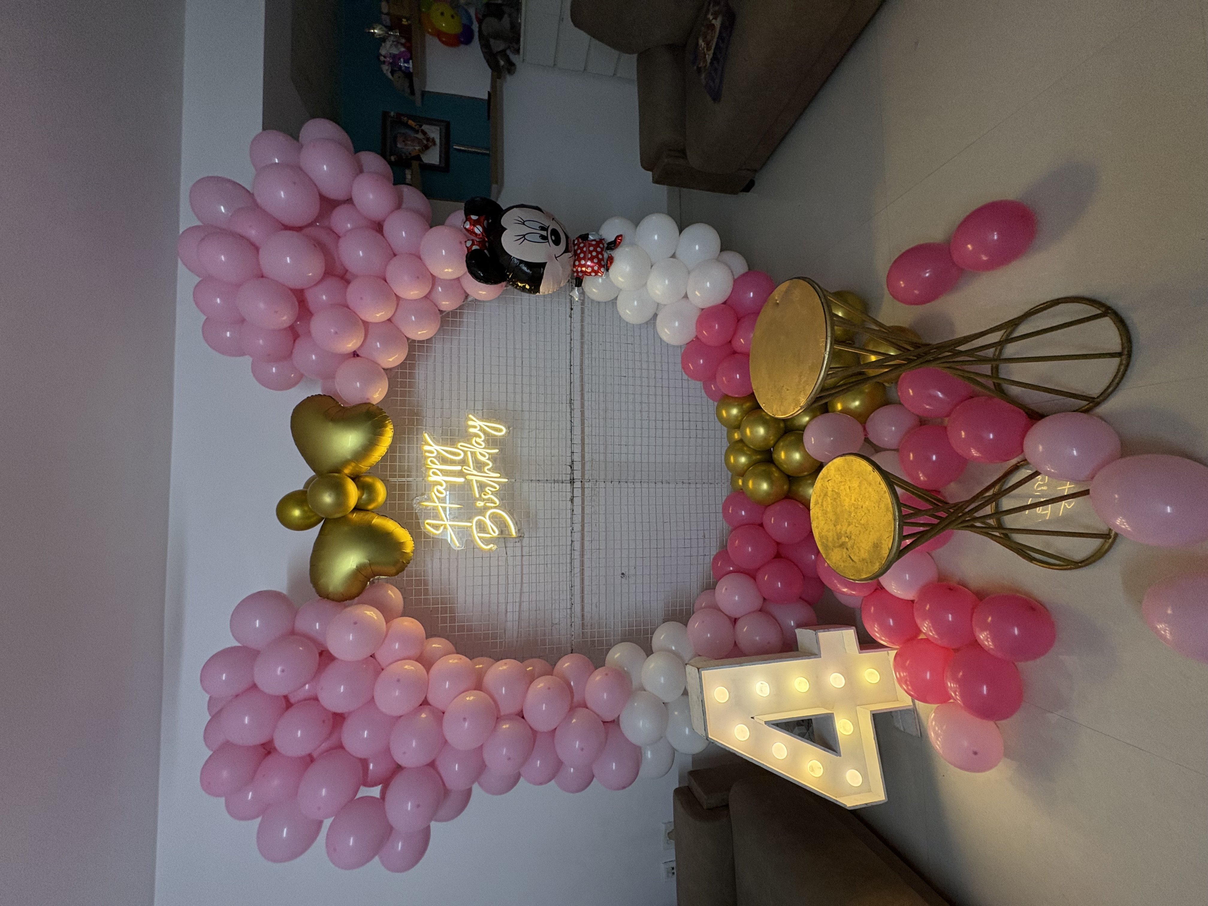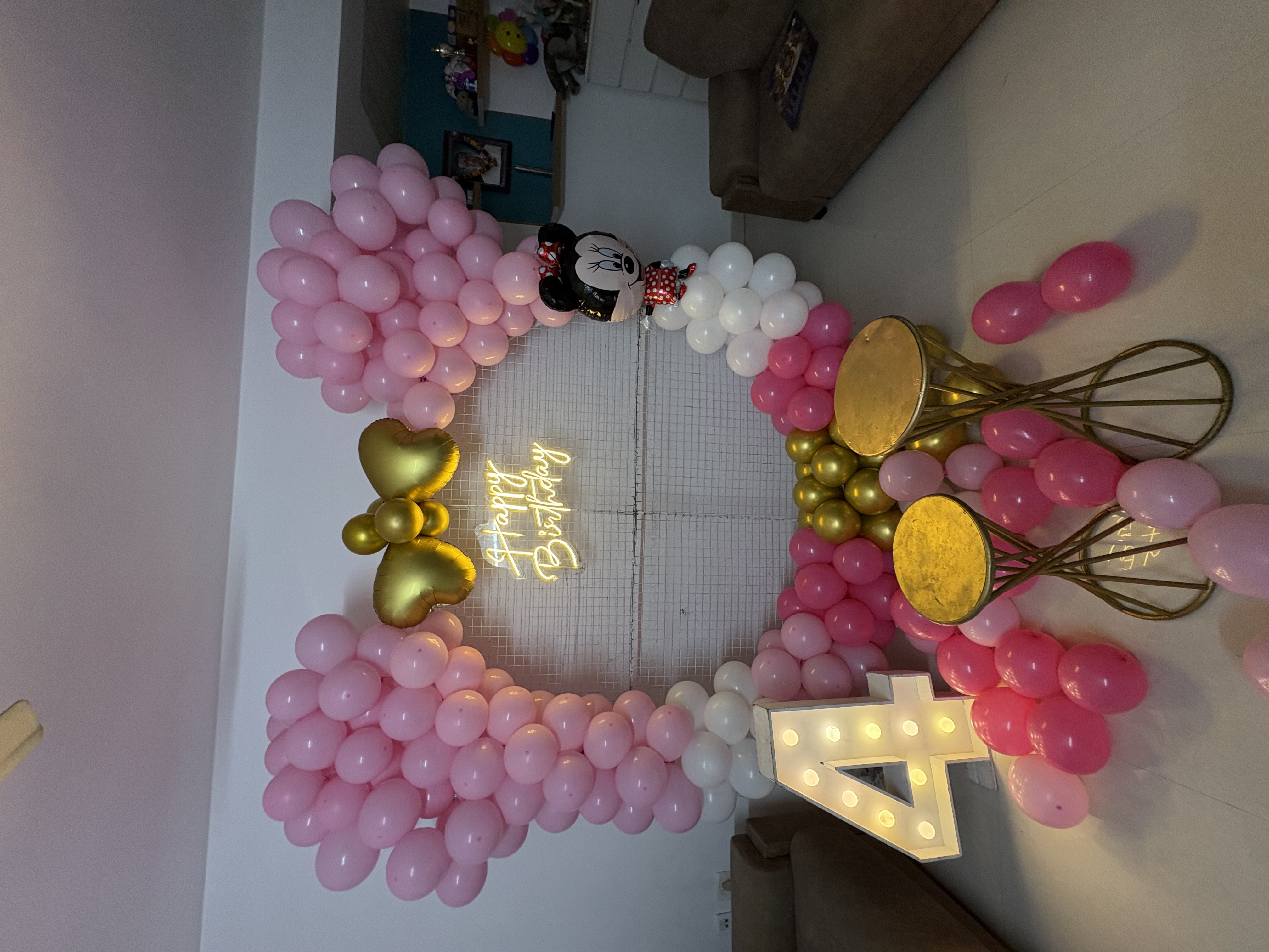• Minnie theme balloon arch of 400 balloons (Pastel pink, White and Golden chrome color)