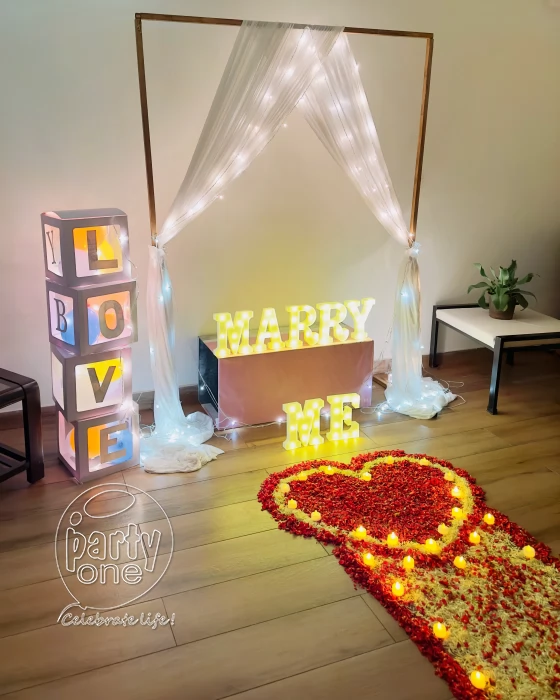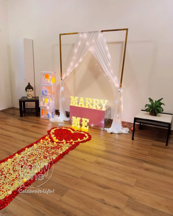 • As important as it is to ask the right question, it is also important to set the perfect decoration while posing such an important question. PartyOne creates an enchanting and romantic ambience for Quirky Marry Me Surprise Proposal Decoration in Mysore. Fresh, fragrant rose flowers give you that sensory satisfaction like no other flowers. A rose petal pathway with both fresh roses and white flowers leading to a red rose heart adored with electric candles adds the perfect amount of spark for your quirky surprise celebrations. This decoration sets that visually pleasing and romantic decoration for all the important milestones for celebrating your love with MARRY ME LED lights and LOVE cubes adored with pixel lights and white net. Choose PartyOne — For setting up the perfect ambience and letting you have a laid-back celebration and enjoy lovely and memorable milestones and score streak-worthy snaps! For a smooth celebration, have a reliable power supply and allocate PartyOne balloon decorators 3 hours prior to the event for everything to come together.