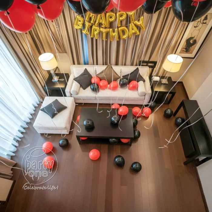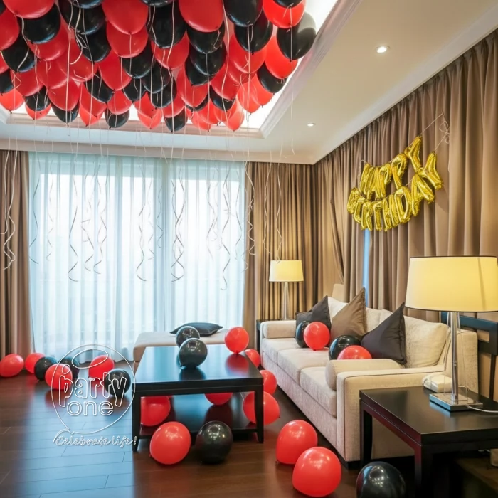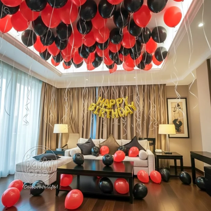 • 100 Red & Black Balloons (Dense Ceiling Fill Setup with Ribbons, Floor & Sofa Decoration)