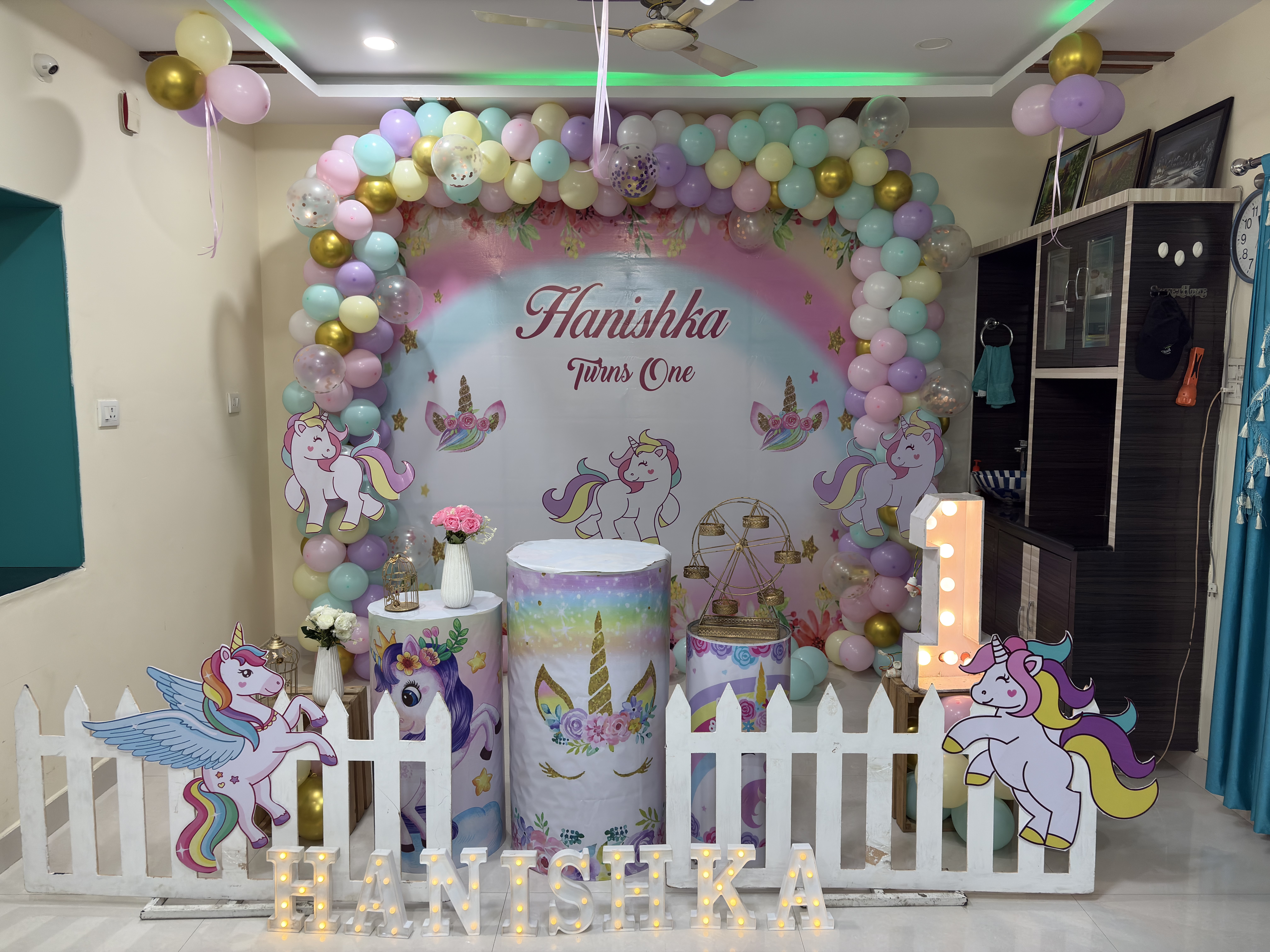 • Balloon arch of 300 balloons (Pastel green, White, Purple, Golden chrome and Pink color)