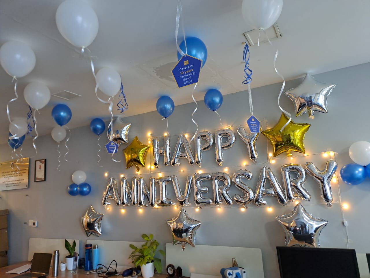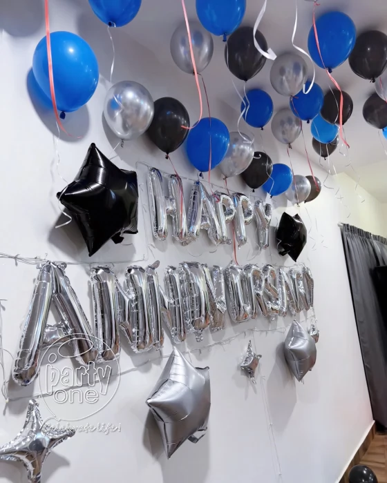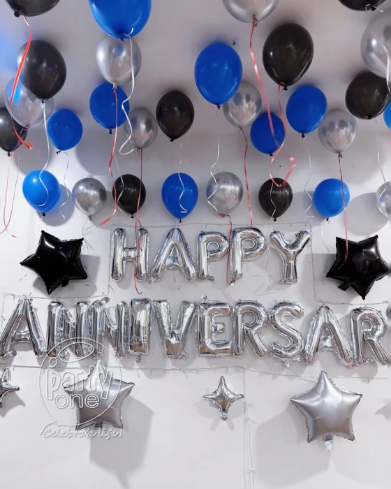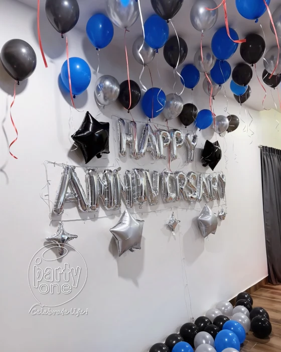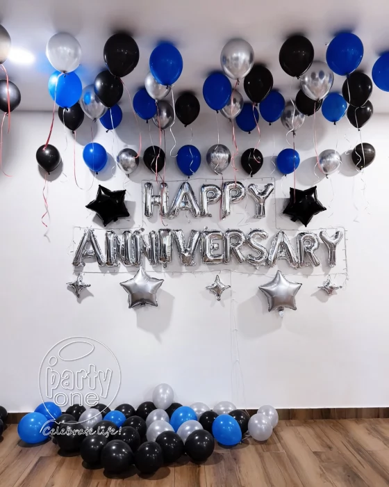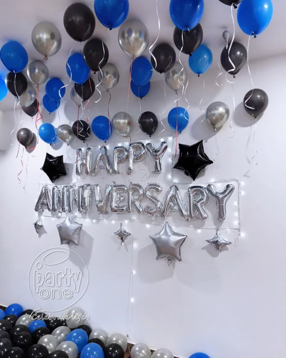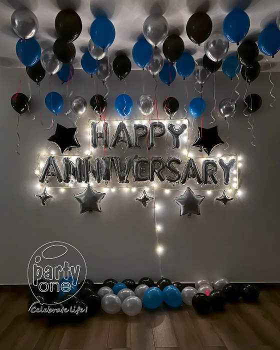 • To celebrate your special day romantically and festively, choose the absolute happy anniversary balloon decoration in Noida to change any room. Make your anniversary memorable with these inclusive decoration items. The “Happy Anniversary” silver letter foil balloons will be the first thing that catches people's attention, since they are meant to create a beautiful spectacle for the celebration. Moreover, there are also fascinating pixel lights that add an enchanting sparkle to it, making it more celebratory. As well as this, there are also black star foil balloons, giving the overall decoration a touch of class and contrast. The package is also made up of small and big silver star foil balloons, which will render a heavenly grace on your décor. Finally, blue, black, and silver coloured balloons placed at odd points on the ceiling with shiny ribbons hanging down from them complete the arrangement up above. These hanging ceiling balloons create a magical tent-like atmosphere that makes you feel like you have entered something very different from just another casual gathering or party setup. Additionally, loose floor balloons are scattered across, bringing in some playfulness in the setting as guests can have fun with them too. This mix of colours and styles creates such versatile and visually captivating looks that make it perfect for reflecting on your love life and dedication to one another through all these years that you two have been together. Celebrate in style with absolute happy anniversary balloon decoration and make your anniversary a memory to cherish forever.