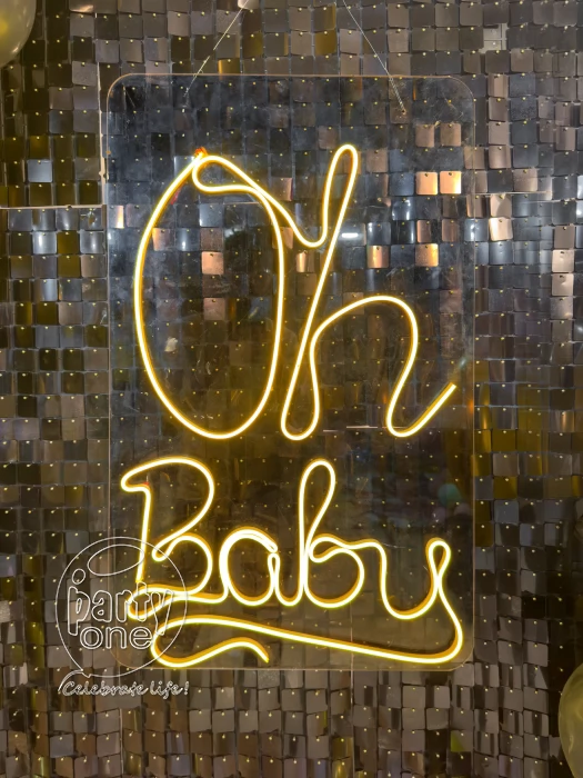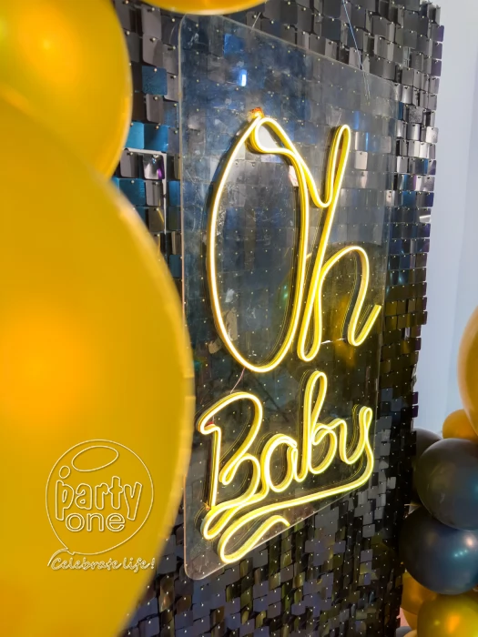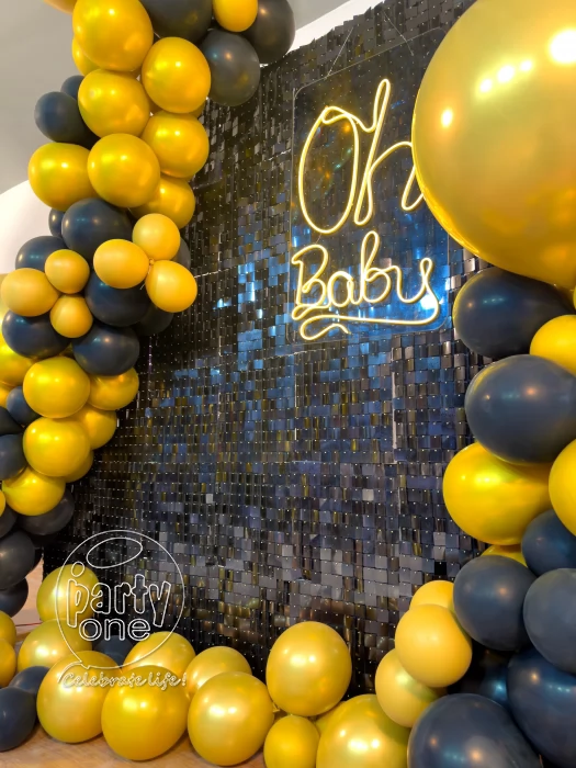 • You won’t believe your eyes! Get ready to change up any space into a jaw-dropping celebration with PartyOne’s Black Sequin Oh Baby Theme Decoration in Noida. Imagine a stunning 6×6 ft black sequin panel catching the light as it sparkles like magic—perfect for those unforgettable photo ops! But wait, there's more: an eye-catching “Oh Baby” neon light that glows with joy and warmth! And just when you thought it couldn’t get better, feast your eyes on a magnificent balloon arch made of 200 balloons in luxe gold chrome and deep black hues. It's an entryway to absolute wonder, not simply an arch! To further increase the excitement, we've added a gorgeous 4-foot balloon arch and four amazing gold chrome macaron balloons! Last but not least, there are twenty loose balloons laid out about like unpopped confetti dreams! This decor adds just the right amount of surprise and dazzle for any “Oh Baby” event worth celebrating, be it a baby shower or naming ceremony. Don't pass this up—start preparing to wow your guests right now! This Black Sequin Oh Baby theme baby shower is an experience waiting to happen, not just decoration. Nothing will be the same about your party going forward. Are you prepared for the praise? Seize yours right away and let the magic start!