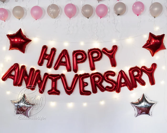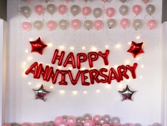 Planning to celebrate wedding anniversary decoration, start by selecting a romantic space like your living room, terrace, balcony, or backyard. A themed setup with the right colours can make the venue more special. Anniversary balloon decor in gold, rose gold, or silver adds an instant vibe. Hang a "happy anniversary" banner and use a simple flower decoration for a romantic approach. For an interactive touch, create a photo zone using anniversary background decoration like a curtain of lights with pictures from your wedding and milestones. A focal cake table with an anniversary topper wedding cake makes a grand centerpiece. Elements like couple initials, framed wows, or a mini memory timeline improve the decor. When you're in doubt, consult PartyOne wedding anniversary decorators who is specialized in romantic gatherings. Even with a small guest list, your wedding anniversary decoration can be classy, romantic, and unforgettable perfect for sharing joy with loved ones while keeping it cozy and meaningful.