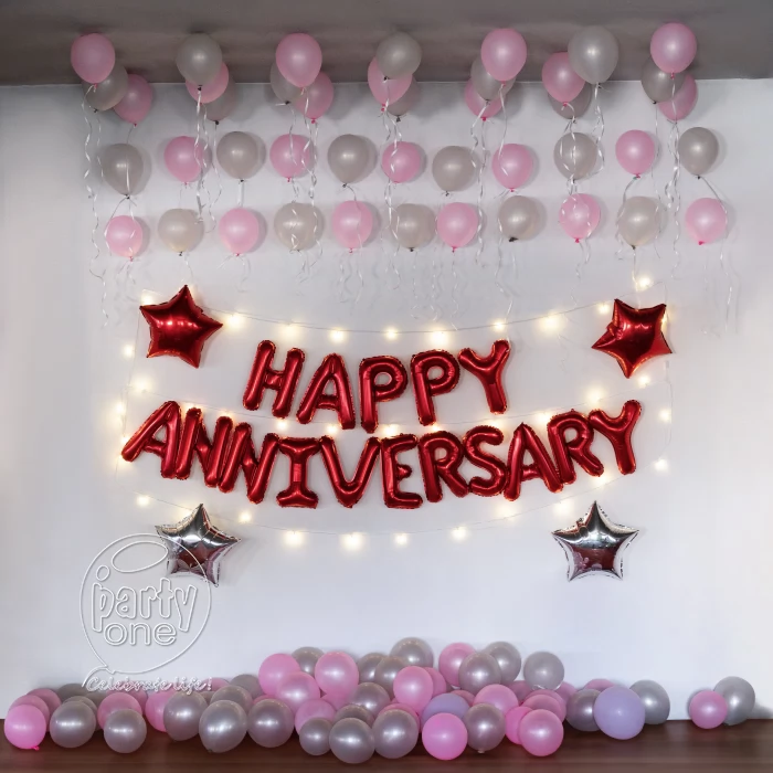 • Life is a beautiful journey, and getting old together is the biggest blessing anyone could ever have. We at PartyOne welcome you to start and celebrate this beautiful journey with us. Get our " Pink Silver Happy Anniversary Decoration" in Noida for celebrations at home. This decoration can also be used in a small celebration for updating your social media about your loved ones’ where you can stylishly introduce your partner to your followers. If you want a different celebration which defies general stereotypes, this decoration is perfect for you. It has a beautiful silver and pink ceiling balloon surprise decoration attached with ribbons that make the environment vibrant and fun. The pixel lights around the Happy Anniversary Foil balloons create a perfect backdrop for photos adored with red and silver stars. So, choose PartyOne decoration to surprise your wife or your husband. Happiness, surprise, and a lot of fun- PartyOne is guaranteed. Make your day memorable with us with just one click. For a smooth celebration, have a reliable power supply and allocate PartyOne balloon decorators 3 hours prior to the event for everything to come together.