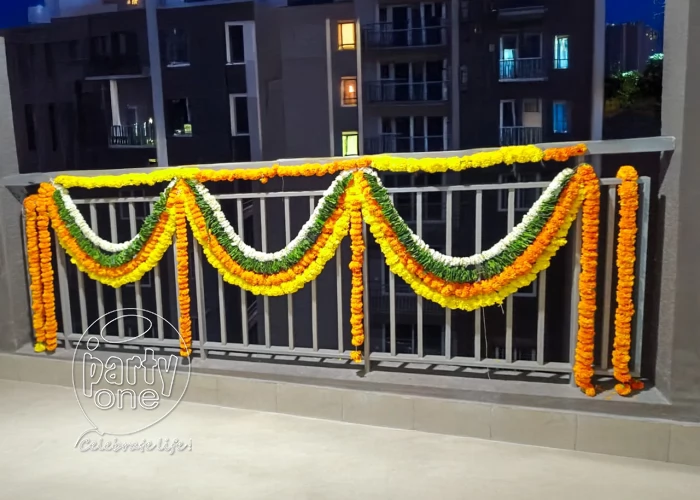 • 1 Terrace balcony with 3 U shape running flower (Green leaves, Yellow Marigold, Orange Marigold and Suganda raja combination)
