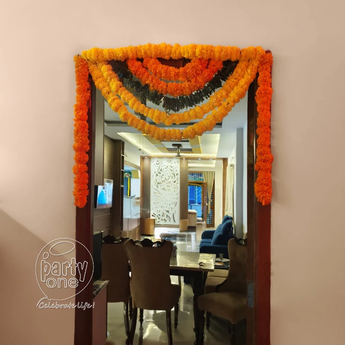 • 30 Flower hangings of 2 ft each (Yellow Marigold, Orange Marigold and Green Leaves with Lilly at the end combination)