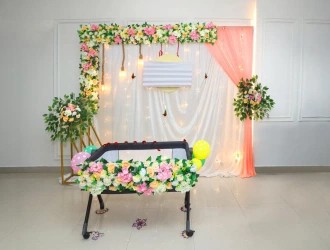 Organizing a naming ceremony is a beautiful way to celebrate a new life in your life. You can celebrate this memorable day in several ways. However, there are a few essentials that only a professional naming ceremony decoration at home planner is aware of. You can avail of PartyOne professional services to throw a party that everyone will remember for years! Our professional naming ceremony decorators take care of everything from picking a date and time that works best for your friends and family to creating a guest list comprising close family members and loved ones. We also help you select a theme that reflects your taste based on colors, nature, or the season. But that's not the only naming ceremony decoration service we offer. PartyOne's baby naming ceremony essentials include decorating the venue with balloons and flowers to transform it into a festive and welcoming space. We also arrange a panditji for the pooja if you are going for a traditional theme. They perform all the rituals as per the authentic vidhi and give the newborn a meaningful name. Besides this, the naming ceremony services offer essentials include photography and videography services to capture precious moments in a timeless frame with absolute proficiency. Our professional cradle ceremony decorators are the masters of the craft, who have been in the field for over 5 years. From baby photography to maternity shoots, they do everything in between in a unique manner! Avail yourself of our professional services at the next naming ceremony to honor your child's name and make the day memorable. Since this occasion is one of the greatest joys in a parent's life, it must be hosted only by the experts!