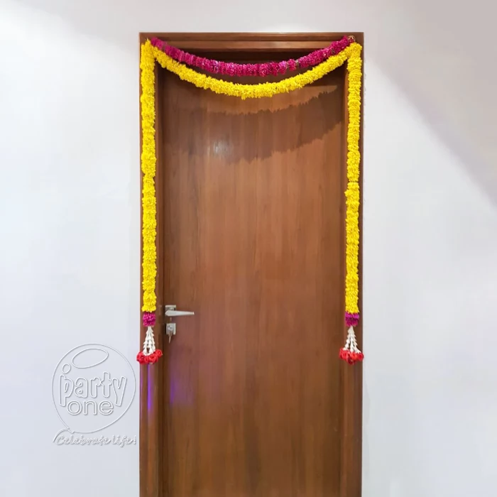 • 1 Pooja room door decor with Suganda, Lilly, Yellow Marigold, Purple Sevanthige flowers