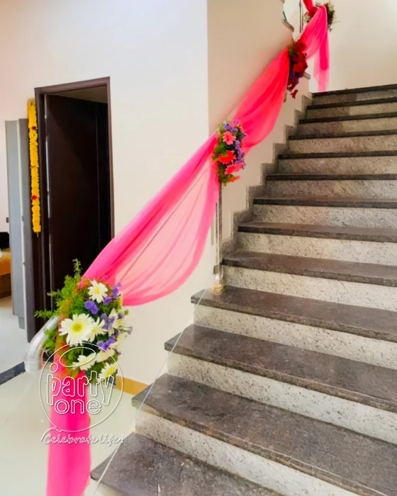• From Ground floor to first floor stair case decoration with 4x40 ft pink cloth and 7 Gerbera flower bunches