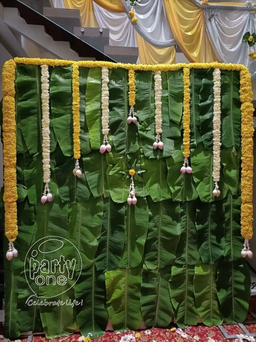 • 1 Satyanarayana Swamy Vratham pooja decor green banana leaves backdrop of 6x6 ft with Marigold, Sunganda and Lilly flower hangings
