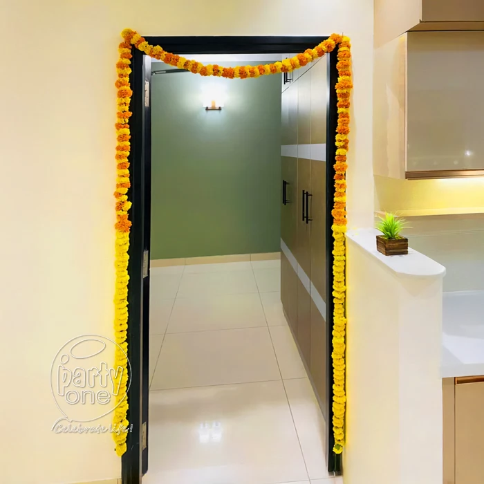 • 1 Pooja room decor with 20 ft Yellow and Orange marigold flowers combination