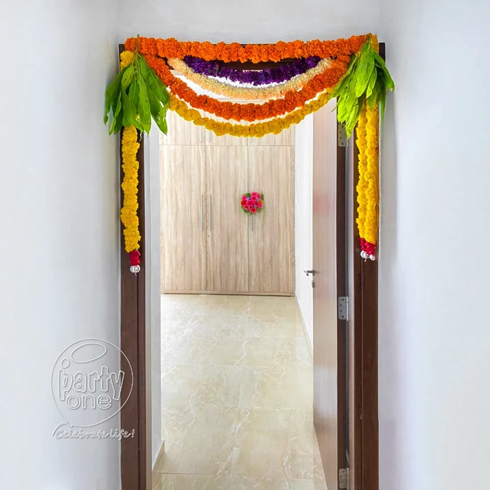 • 1 Internal door decor (Red and Yellow Marigold, Suganda raja, Purple Sevanthige flowers, 2 Silver balls and 2 Mango leave bunches)