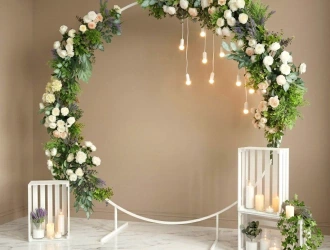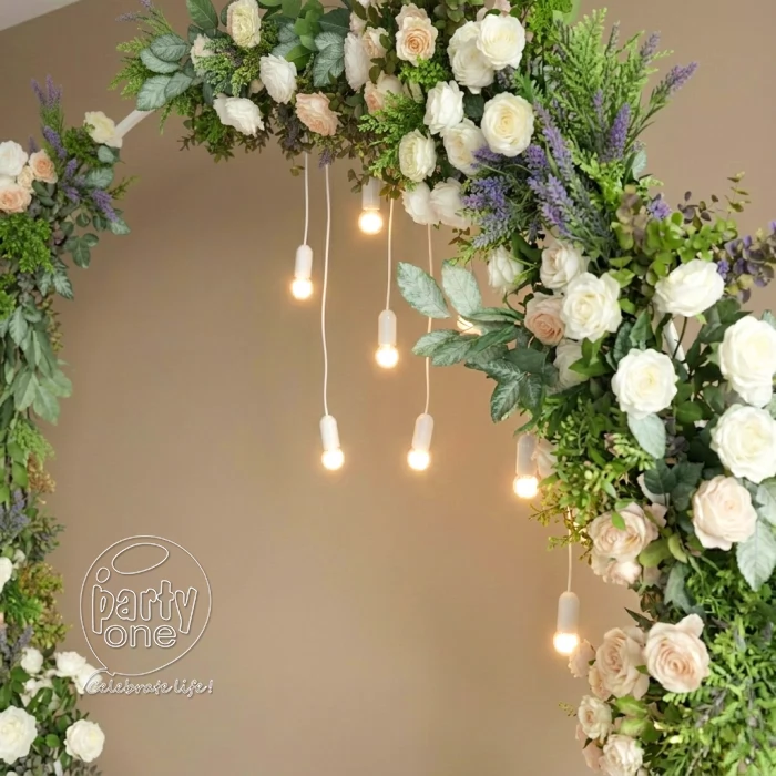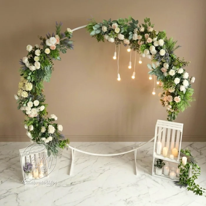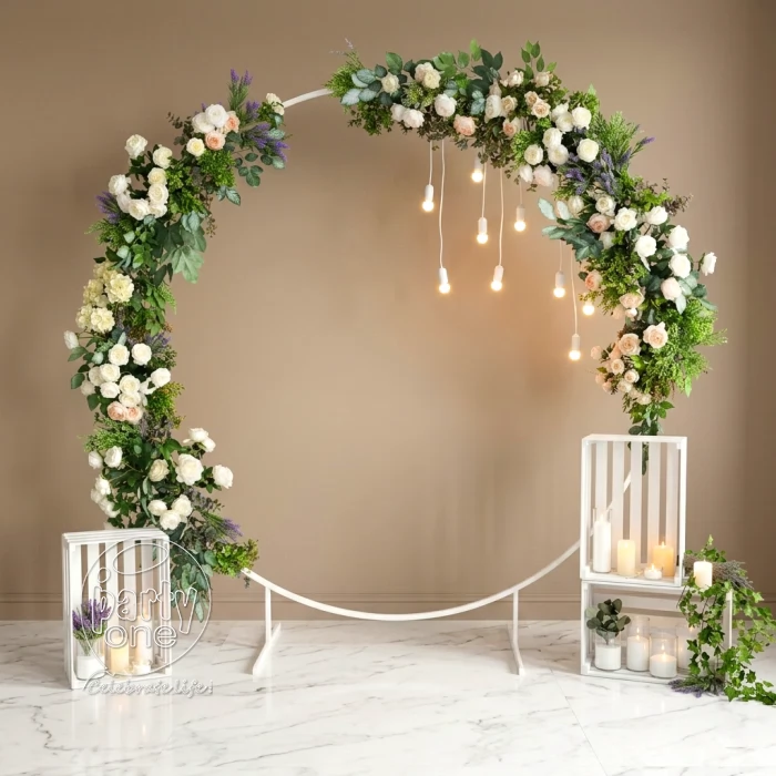 • 1 organic half-floral ring arch (artificial greenery, white & pastel flowers)
