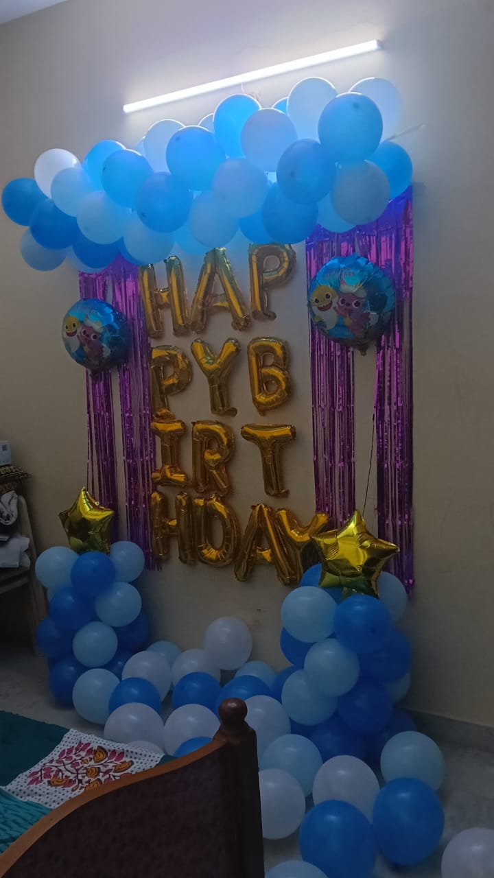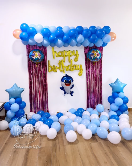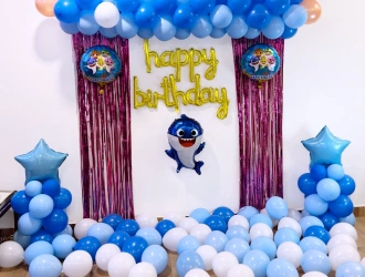 • Create a magical underwater adventure with our Cute Baby Shark Birthday Home Decoration in Thane for your kid's birthday. Our package includes an eye-catching arch and pillars made from 70 pastel blue, light blue, orange, and metallic blue balloons, creating a beautiful oceanic backdrop. The golden cursive "Happy Birthday" foil balloon adds a touch of elegance, while kids would love to play with 50 extra floating balloons. Delight your little one with a set of 5 Baby Shark-themed foil balloons that bring their favorite characters to life. Two pink frill curtains add a splash of color and flair, perfect for photo opportunities. The included fairy light will cast a warm, magical glow over the entire setup, making the event even more memorable. We would request you to kindly make an arrangement of 3 hr power supply for uninterrupted fun. This decor will create a festive, fun-filled atmosphere that will leave your child and guests in awe.