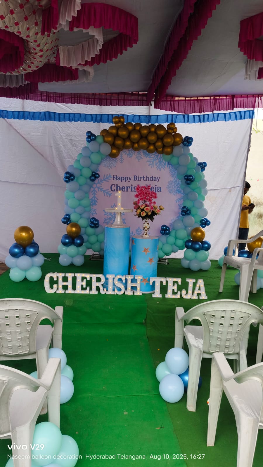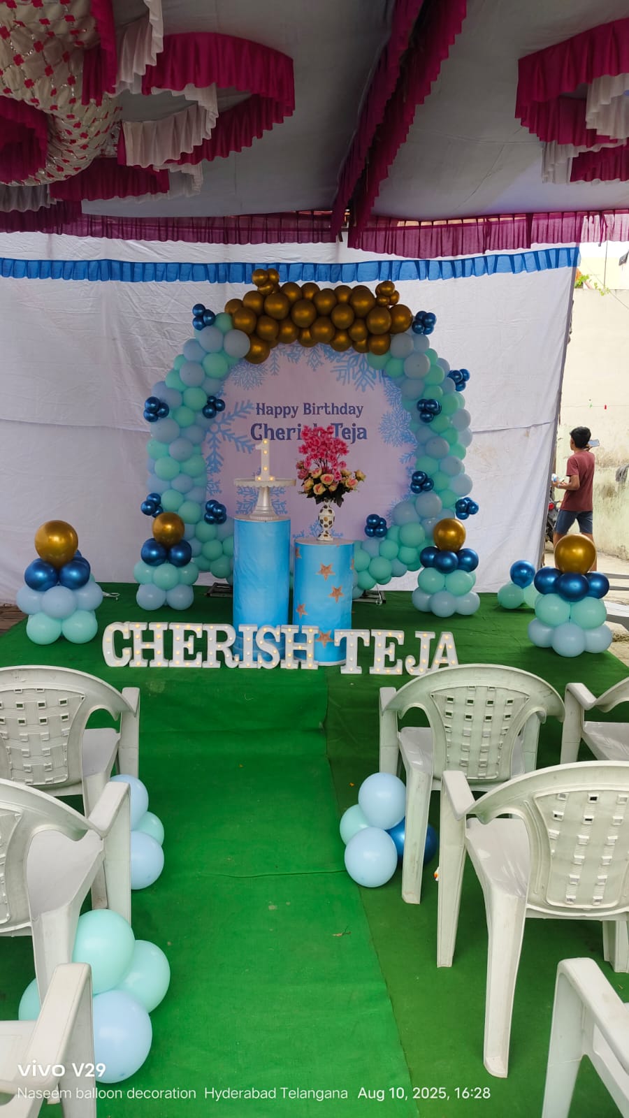 • Balloon arch of 250 balloons (Pastel blue, Golden chrome and Blue chrome color)