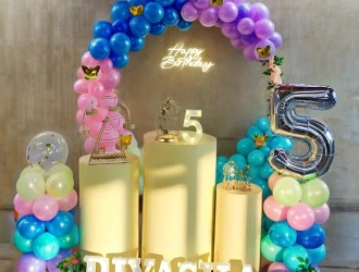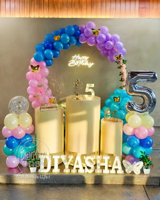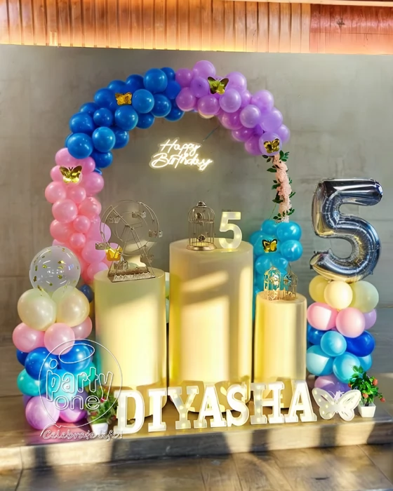 • Impress your guests with our PartyOnes' fabulous decor at your Five & Fabulous Birthday Ring in Thane! An energetic setup with balloons and delightful neon lights, this setting is perfect for a fabulous moment of unforgettable memories that your guests will be talking about. No need to worry anymore about how to plan and throw the best birthday party with our all-inclusive birthday decoration! Everything from the shimmering butterflies down to the charming little bird cages is planned for the little one to feel like royalty on the big day! And with our eye-catching decor, the pictures taken will shine even brighter! Just think about it—all those huge smiles among all that light, all those balloons numerous and colorful—your every memory is set to be just Insta-ready and full of joy! Let the children celebrate in their own way and let their dream fly high together with friends under this wonderful setup! Celebrating with the joyful elements, this setup ensures that the ambience is achieved with a lot of laughter, playfulness, and happiness, cherished even after the cake is no longer there. Make the party your own with LED letters forming your child's name and their age—it's all about making them feel special on their big day in Thane with PartyOne! Our thoughtful elements create a birthday bonanza where every nook reflects love, joy, and good times.